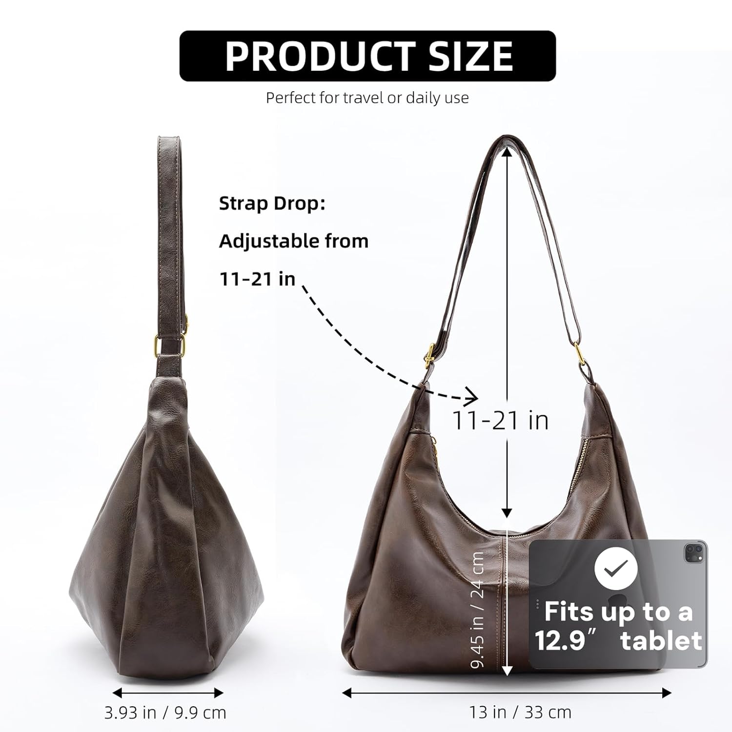 - [Capacity] Dimensions: 13″ (L) x 3.93″ (W) x 9.75″ (H). This slouchy bags for women fits an iPad, phone, wallet, sunglasses, keys, and essentials. As a practical brown purse, itโs ideal as a multifunctional shoulder bag for work or a stylish business handbag