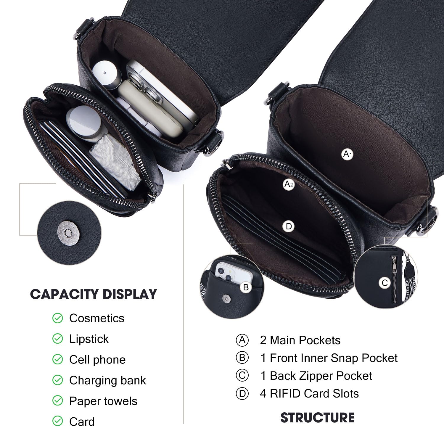 - Upgraded-Version Phone Purse:Cell phone purse With a flat front magnetic snap phone space,design for keep phone in right place salely & convenient access your phone when in outside .Interior size could better fit most cell phones (With Slim Case) Not larger than 6.7 inches. The back has a vertical anti-theft zipper pocket for items you want to keep out of sight and protected