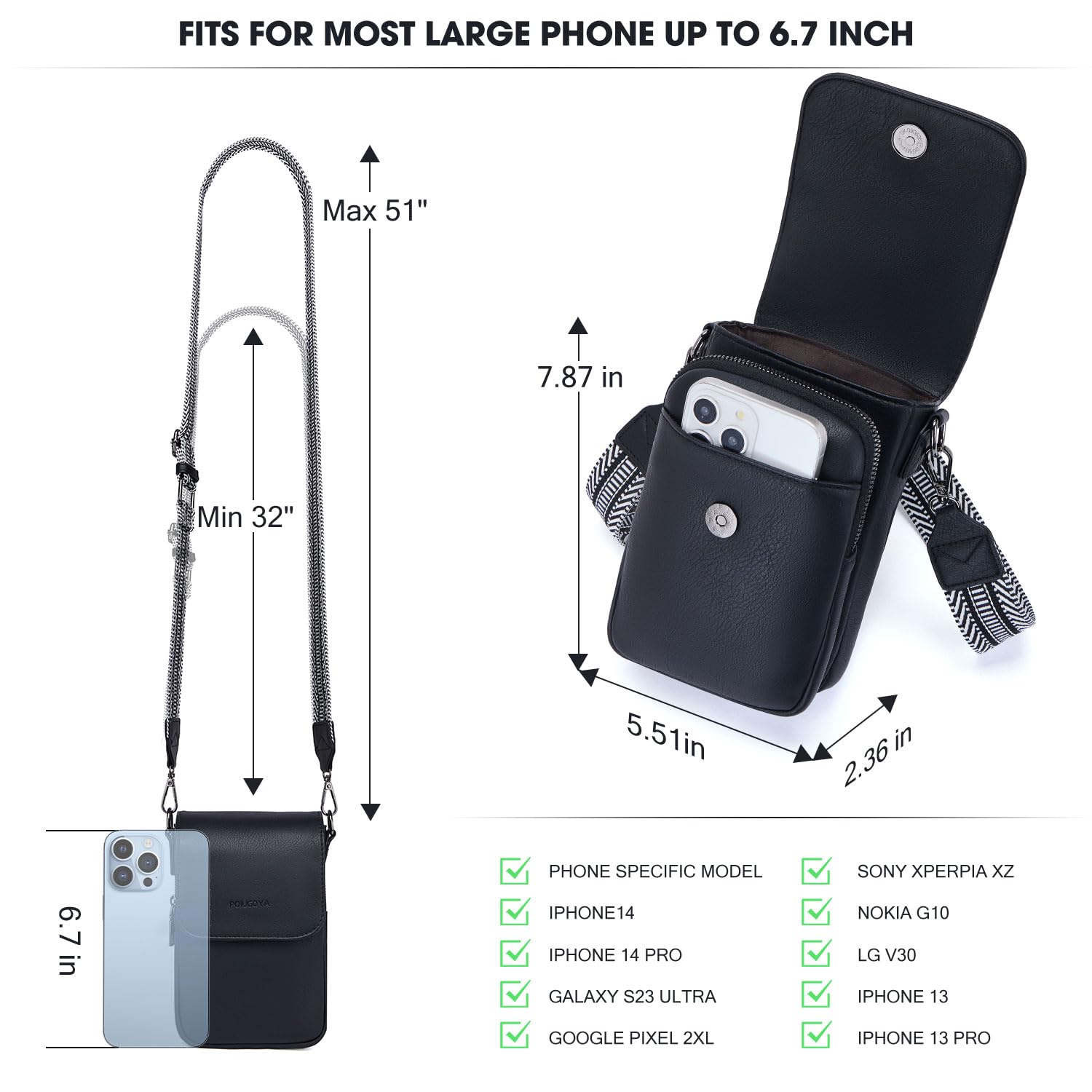 - Compact Size] Size:5.51″(L) x 2.36″(W) x 7.08″(H); Cell phone purse small size is ideal size to fit the smart mobile phones with a big screen of 6.7 inch and below. Come with unique adjustable & removable guitar strap; Adjustable shoulder strap length (32″ to 51″). Lightweight & Wide Strap aim to the comfortable to carry in each day. Small crossbody bag ideal option for outdoor use (walking,camping,shopping etc) and travel,daily life use as well