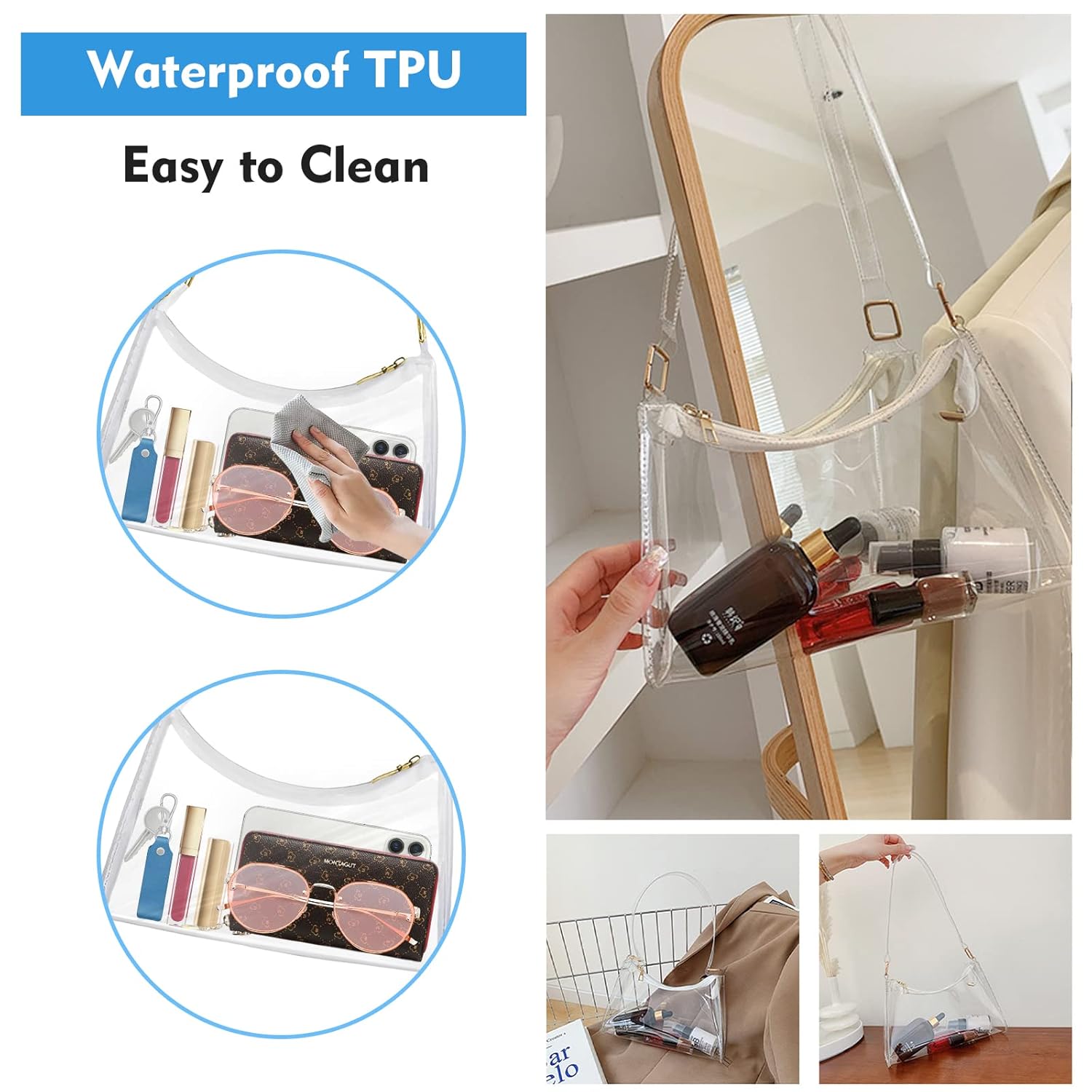 - Durable:10 inch width* 16 inch long ,this Clear Crossbody Bag with handle fits for iPhone16 Pro Max, power bank, wallet, sun glasses, mirror, lipsticks, keys, or some small articles. The clear clutch purse for women is made of 1mm thickness TPU material with no odd smell, eco-friendly, durable, waterproof, and very easy and quick to clean.