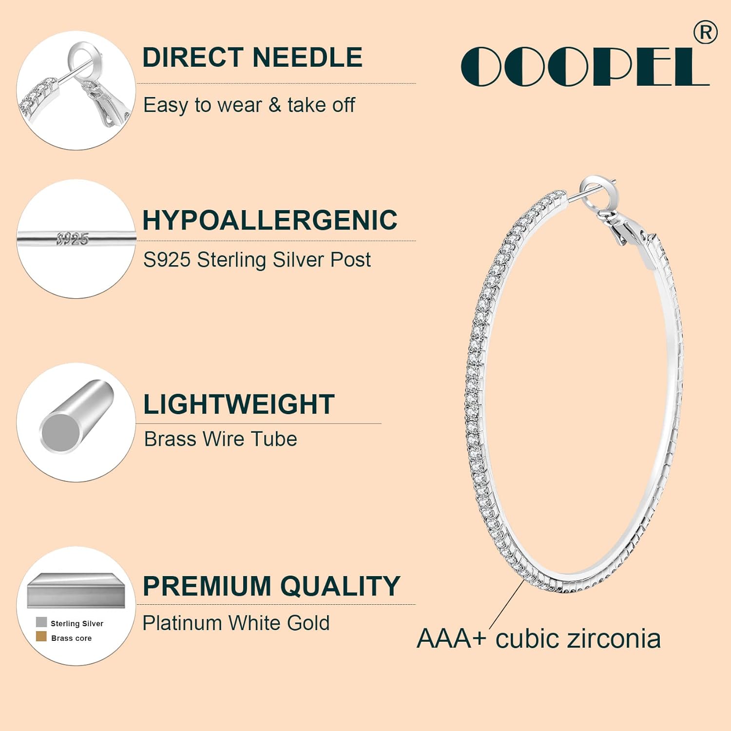 - LIGHTWEIGHT STERLING SILVER HOOPS:Classic sparkly rhinestone hoop earrings are a great statement piece for any outfit, All eyes are sure to be on you when you accessorize with OOOPEL hoop earrings featuring large silver hoops with shimmering rhinestone detailing.