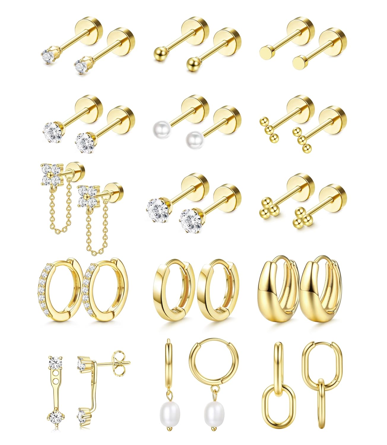 - 【Trendy Stud & Hoop Earrings Set】The 14K gold plated earrings set come with 15 pairs of different stud and hoop earrings,which is rich in styles,such as 9 pairs flat back earrings studs,earring jackets,pearl dangle earrings,chunky hoop earrings,it is the great ideal choice for various occasions and wearing needs