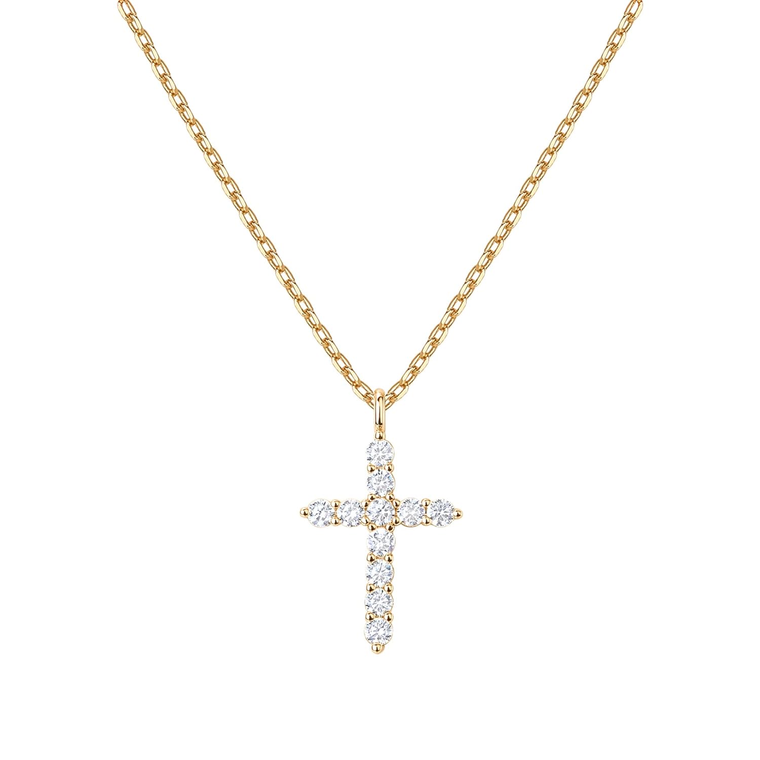 - HIGHLIGHTS: This women’s cross-shaped faith necklace is crafted from hand-selected AAAAA-quality cubic zirconia and plated in 14K yellow gold. It features a 19-inch sliding chain that comfortably fits all neck sizes.