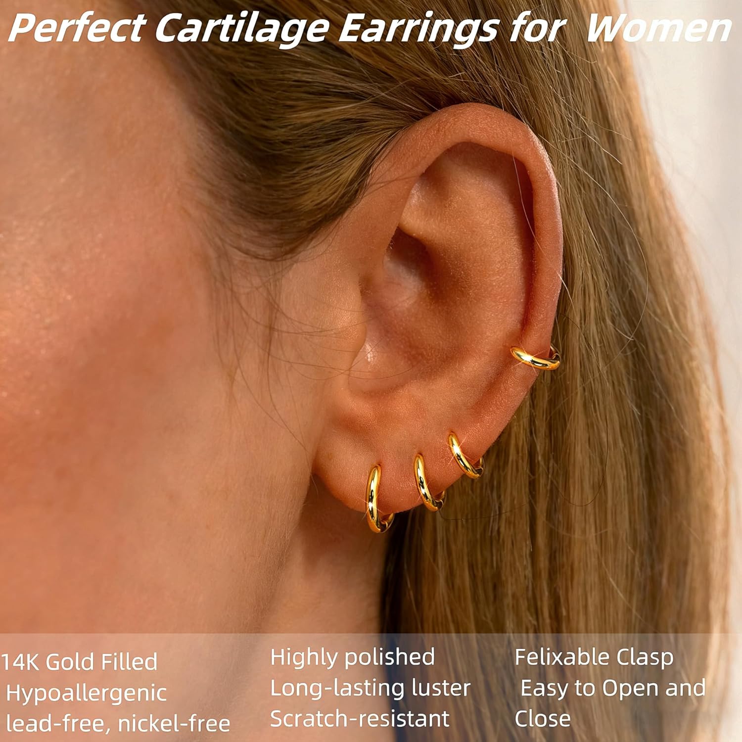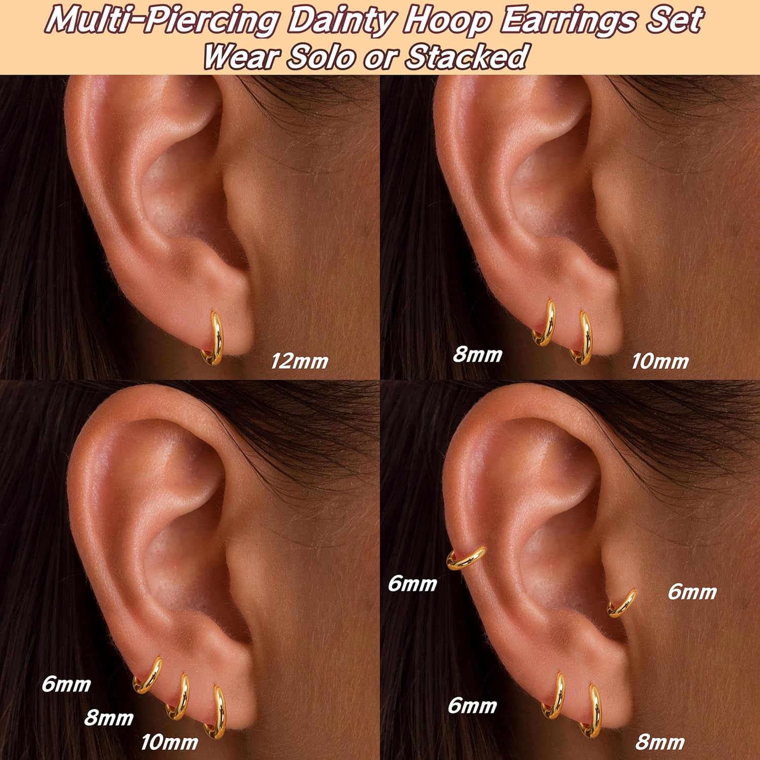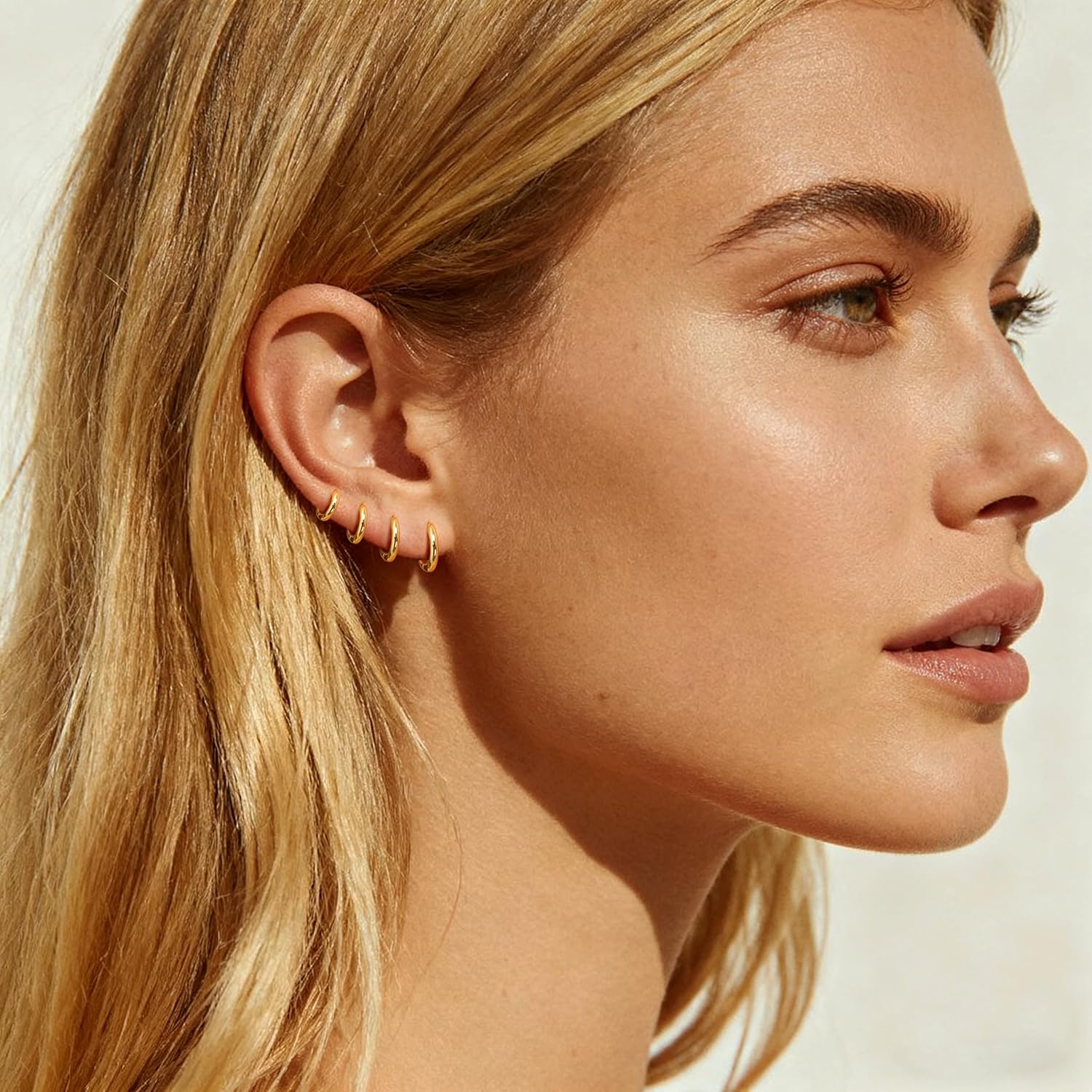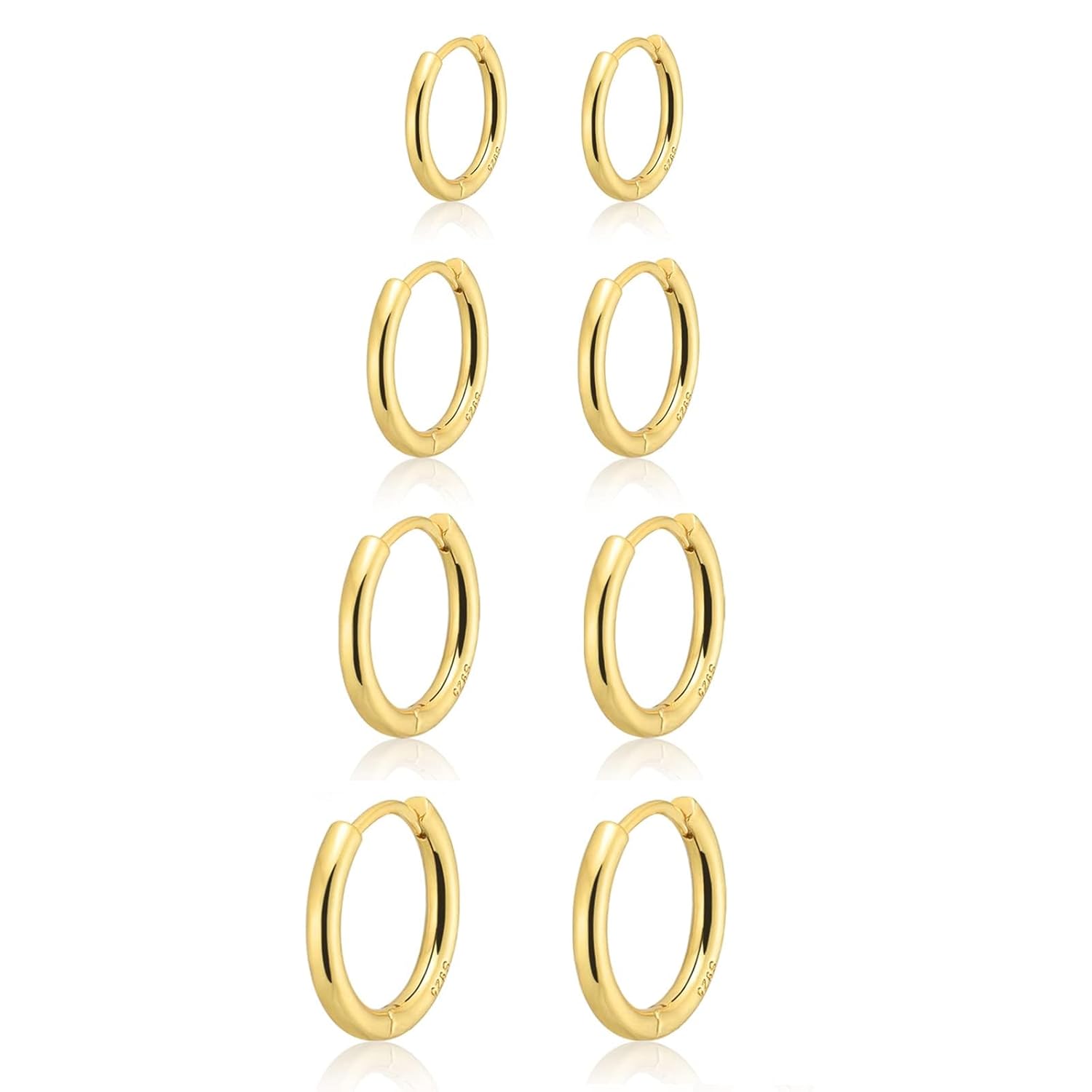 - ใGold Huggies Earrings SetใThe diameter of the 4 pairs gold hoop earrings are 6mm/8mm/10mm/12mm, the 4 sizes give you the opportunity to mix and match with other earrings, you can match them as you like.They can be used as Nose rings, Helix earrrings ,Forward helix earrings,Septum ring ,Daith earrings, Lobe earrings, Lip rings ,Tragus earrings, Belly button rings,Nipple ring,Snug earrings๏ผAnti-tragus earrings,Upper lobe earrings,standard lobe,transverse lobe and Rook earrings body piercing hoop ring.