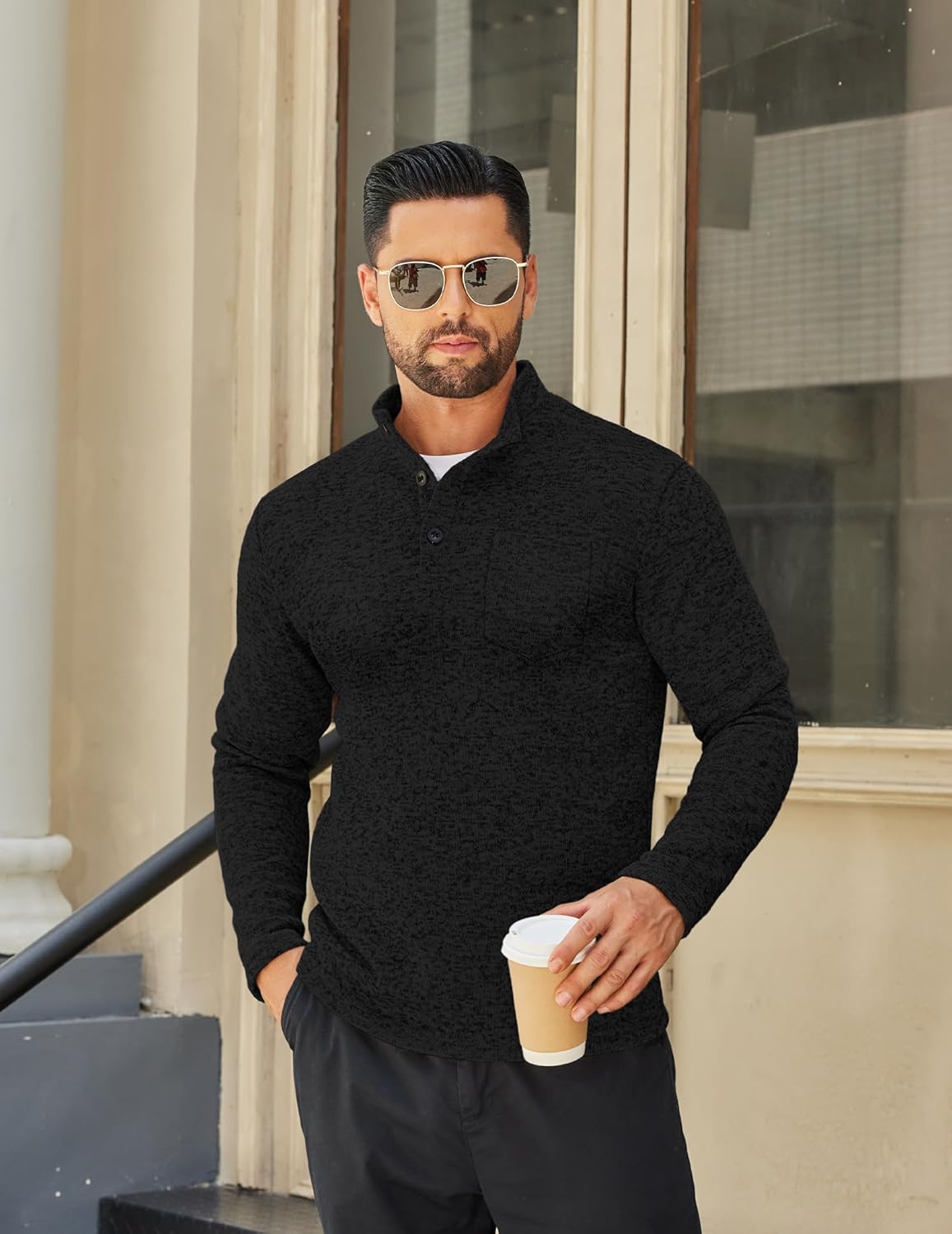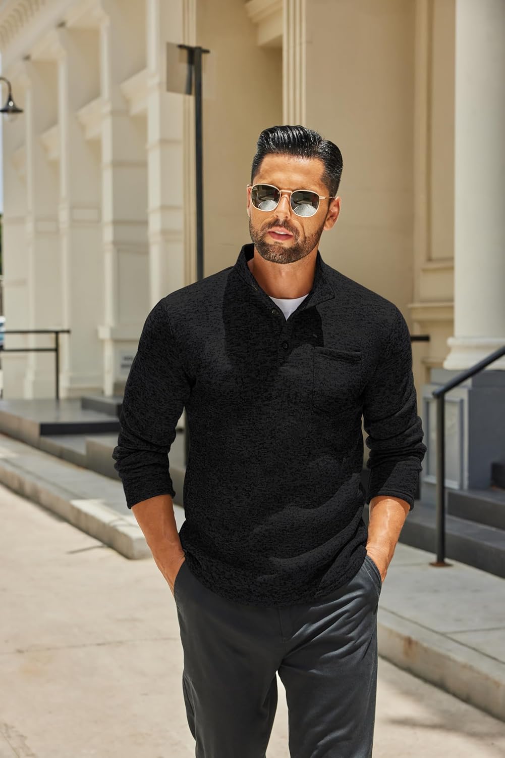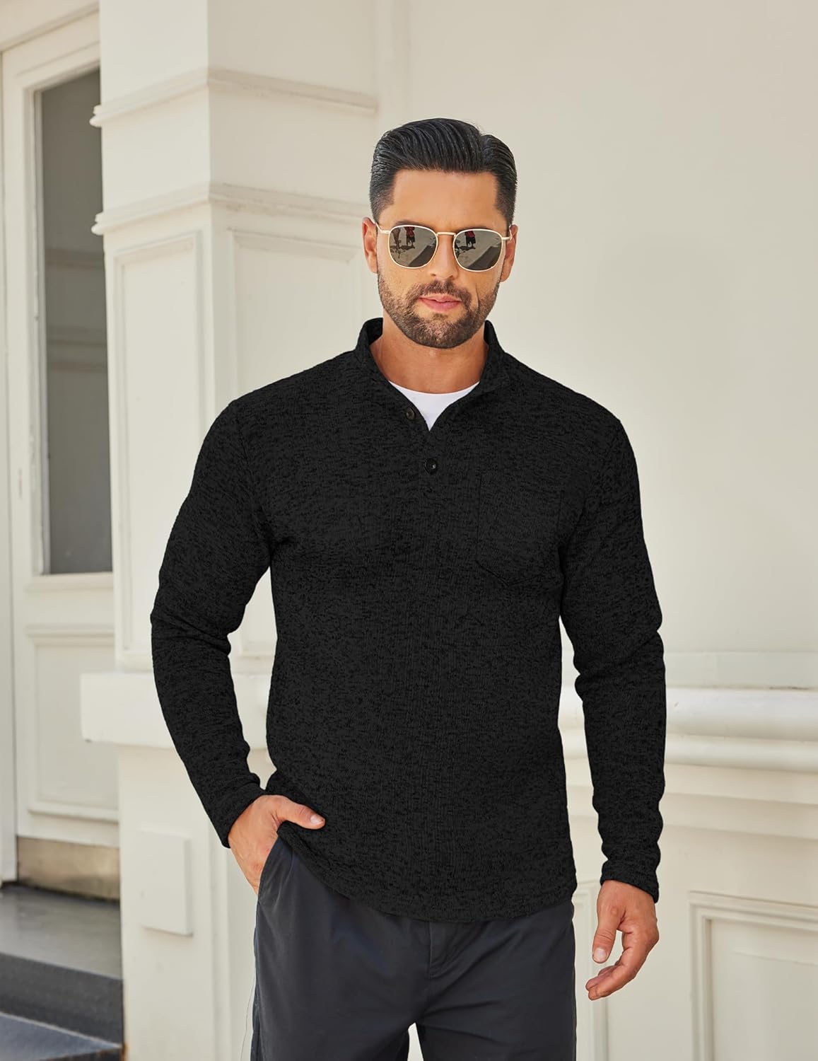 - Special Design —- The men fashion henley sweater has stylish design, ribbed stand collar with 3 buttons, slim fit version with a front pocket, long sleeve, ribbed hem and cuffs, button-up closure easy to put on-off.