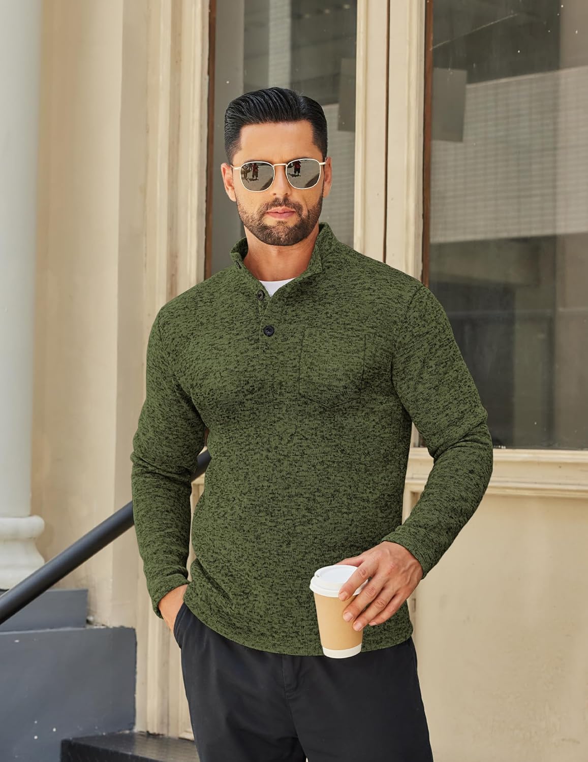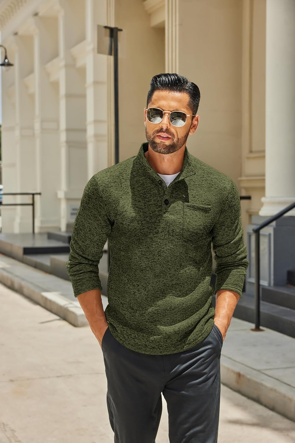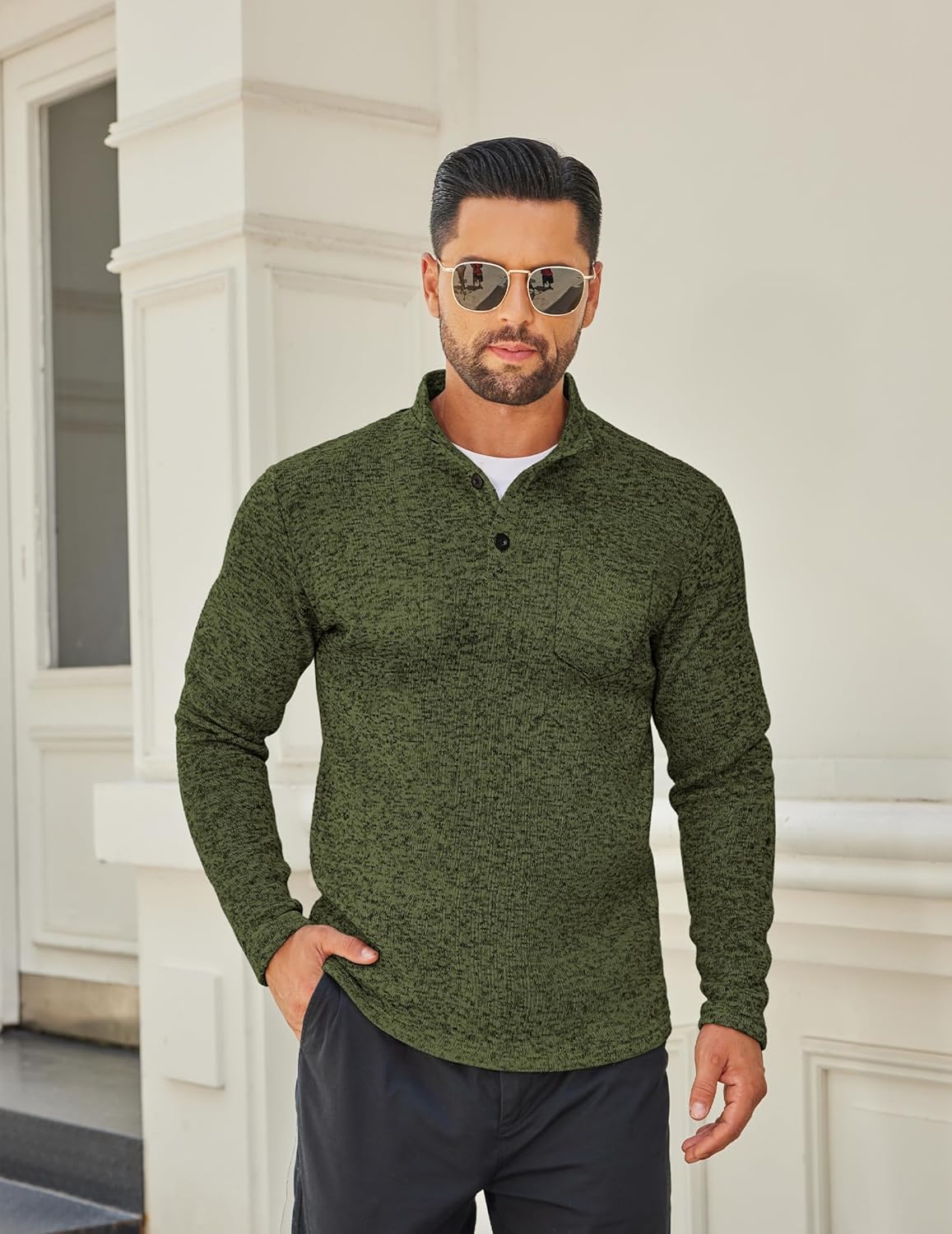 - Special Design —- The men fashion henley sweater has stylish design, ribbed stand collar with 3 buttons, slim fit version with a front pocket, long sleeve, ribbed hem and cuffs, button-up closure easy to put on-off.