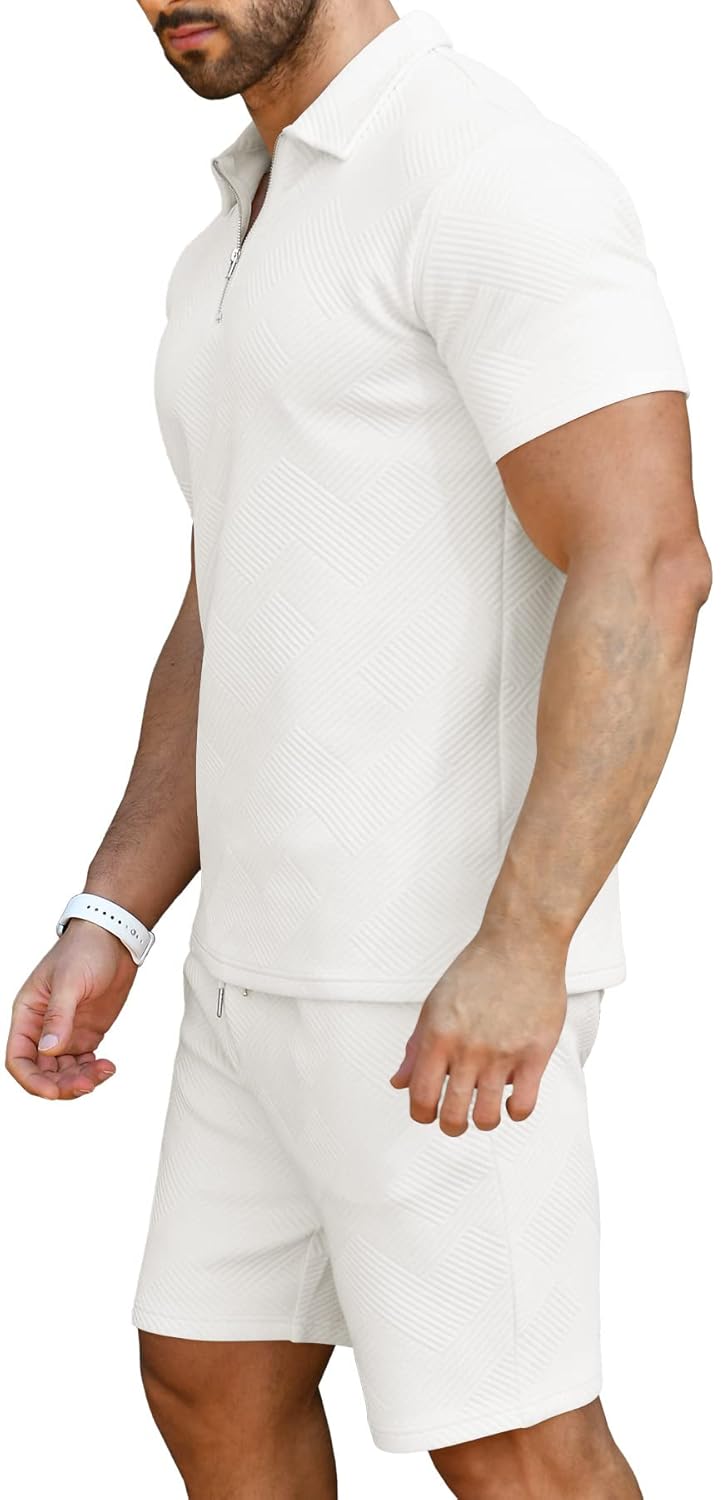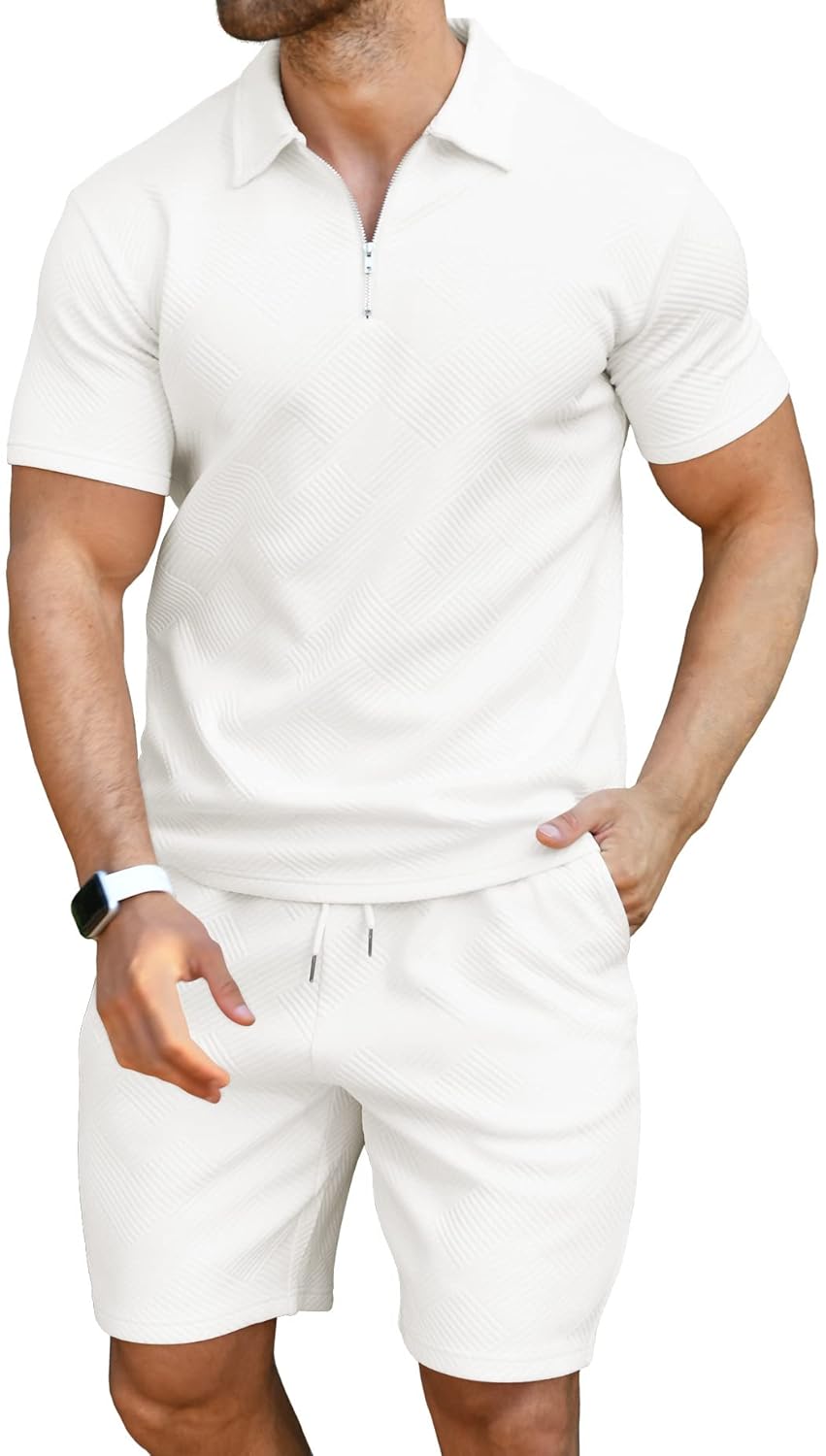 - This zipper polo suits for men set with a pair of tailored hats, loafers and finish with sunglasses for a athleisure vibe.No matter how to match up, it looks very attractive