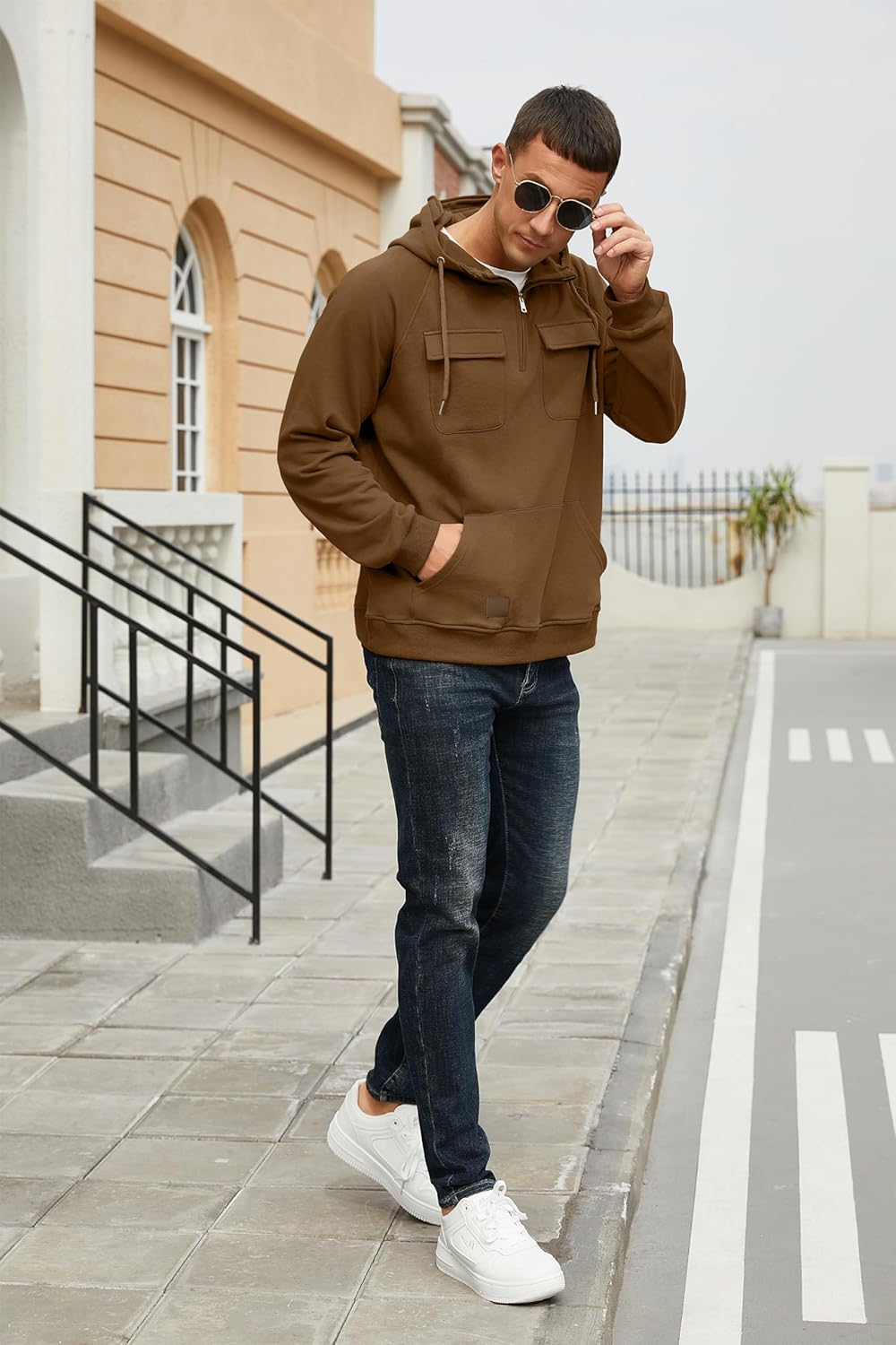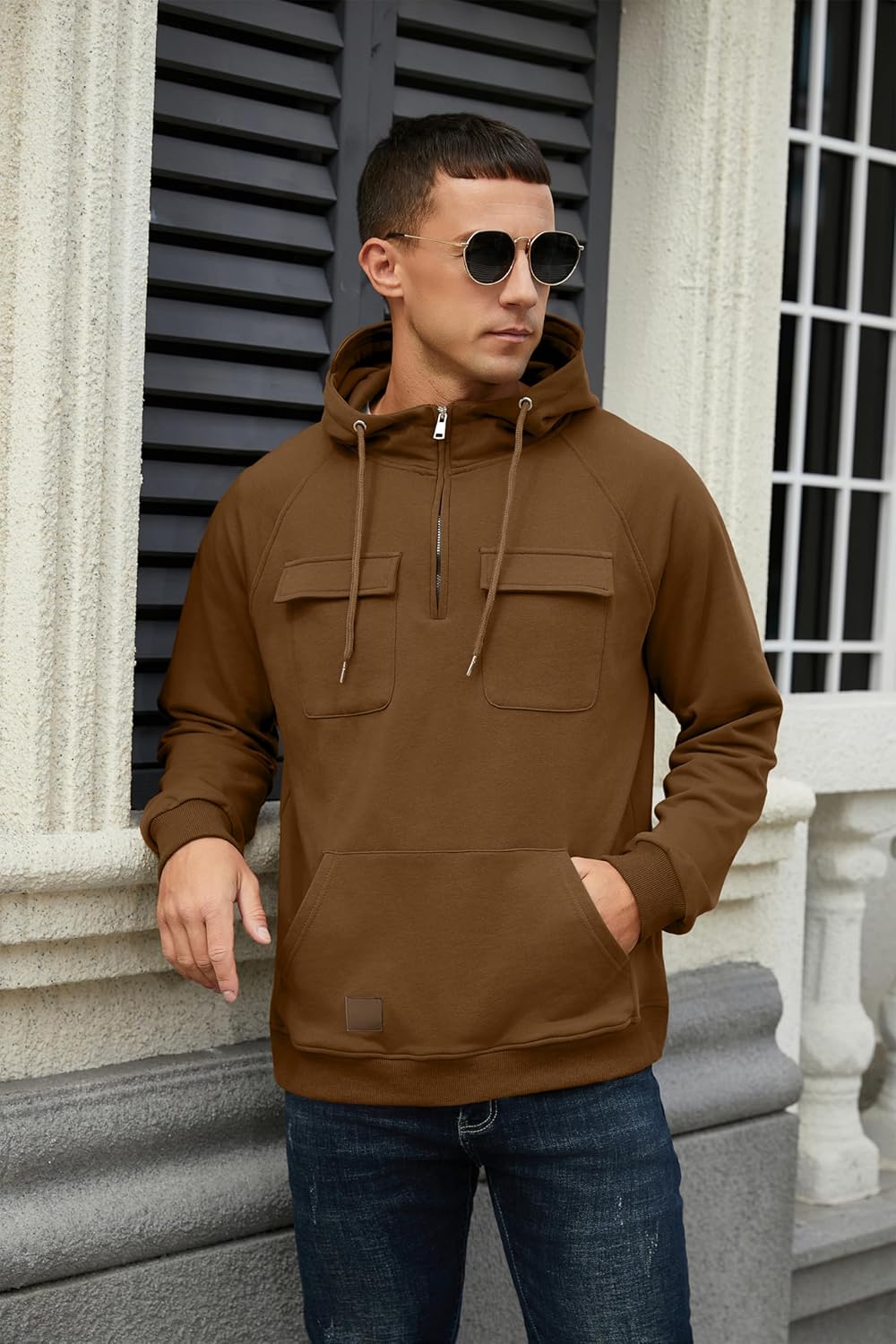 - 2024 New Design : Quarter-Zip hooded sweatshirts with 2 practical cargo pockets and a kangaroo pocket, which allows you to hold your cell phone, wallet, keys, cards, etc. Easy to fit different body types, ยผ zip front makes for easy layering, cargo hoodies are more stylish than the classic sweatshirts.