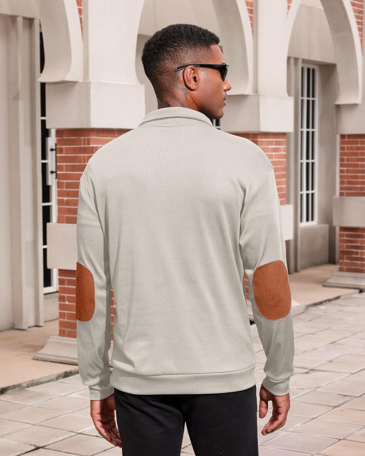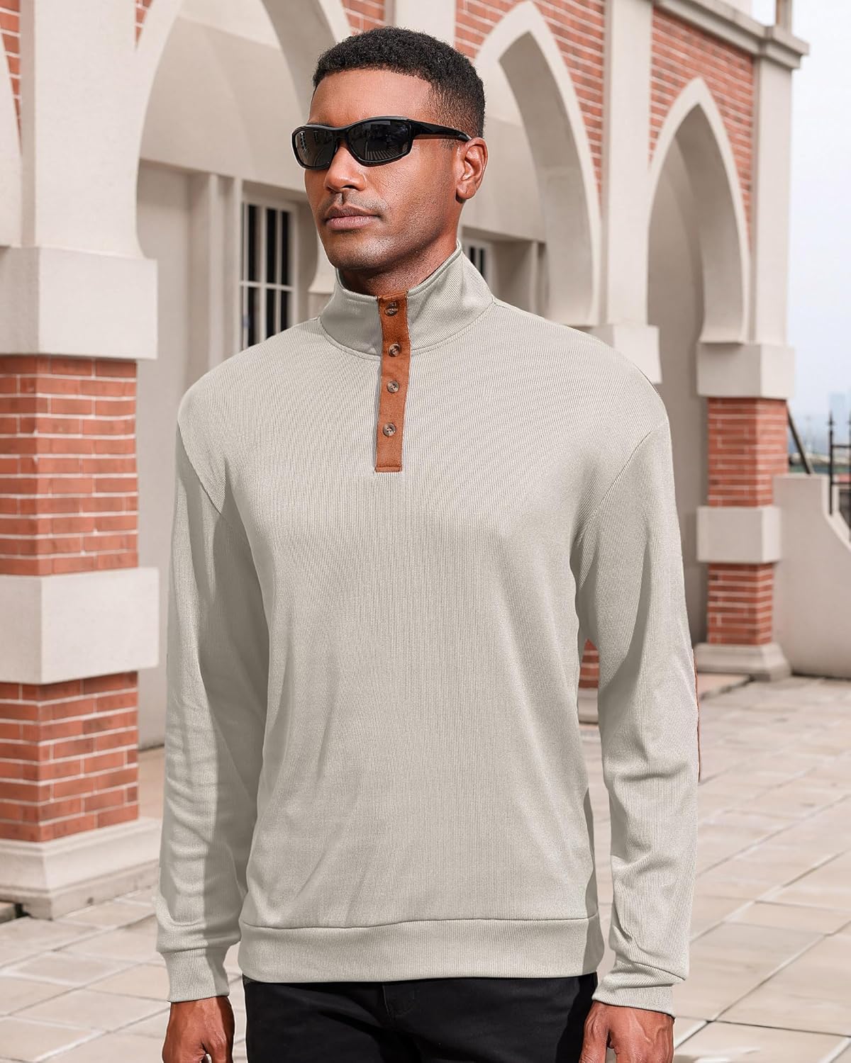 - Design: Features long sleeves, a button-up neck, and a stand collar. The collar and elbows are accented with suede patches, and it includes high-quality button closures.
