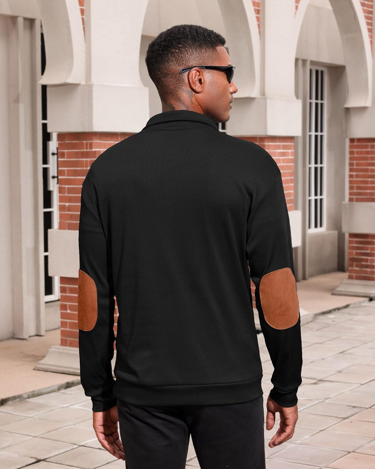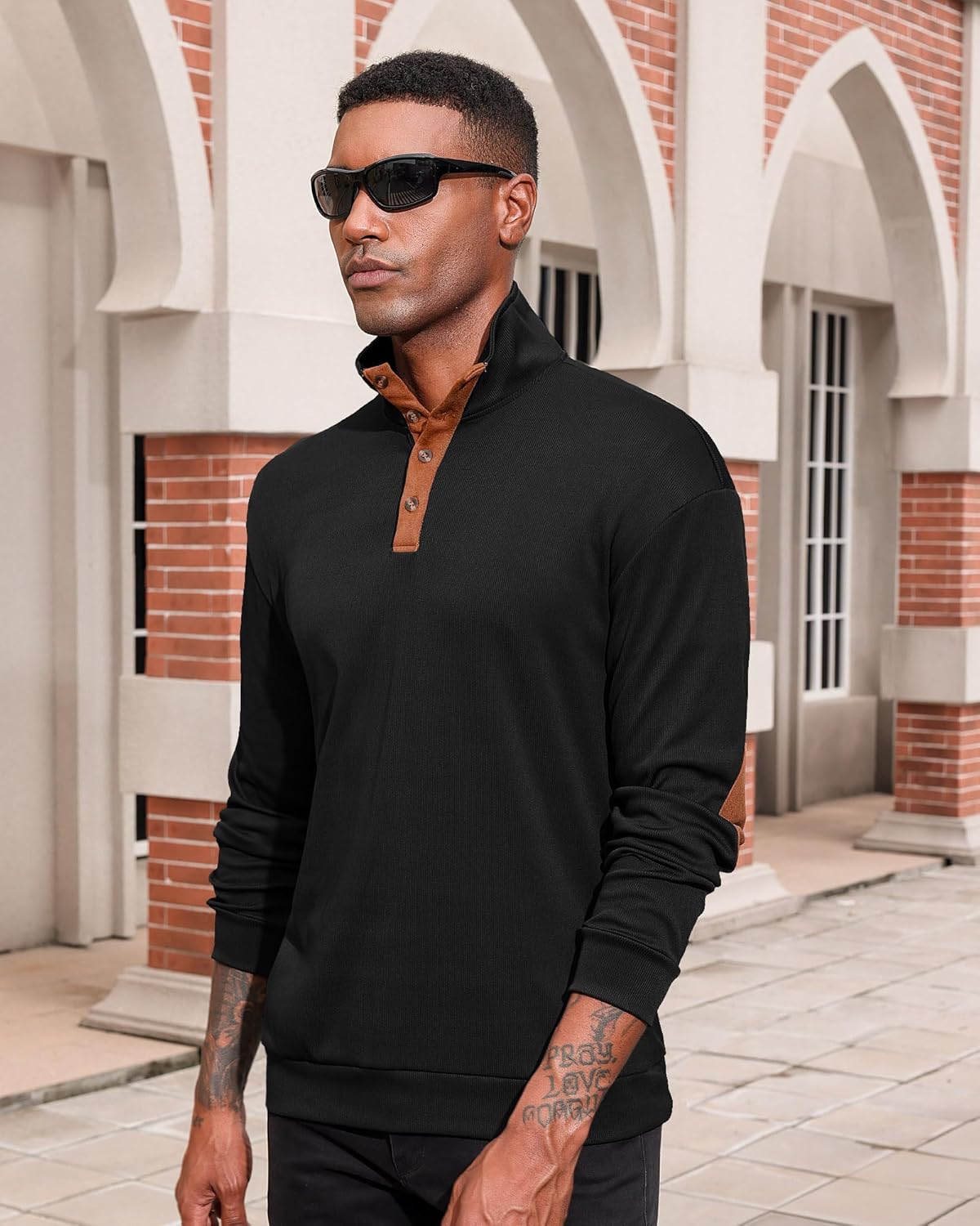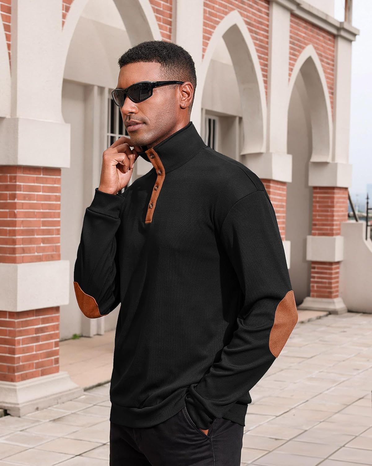 - Design: Features long sleeves, a button-up neck, and a stand collar. The collar and elbows are accented with suede patches, and it includes high-quality button closures.