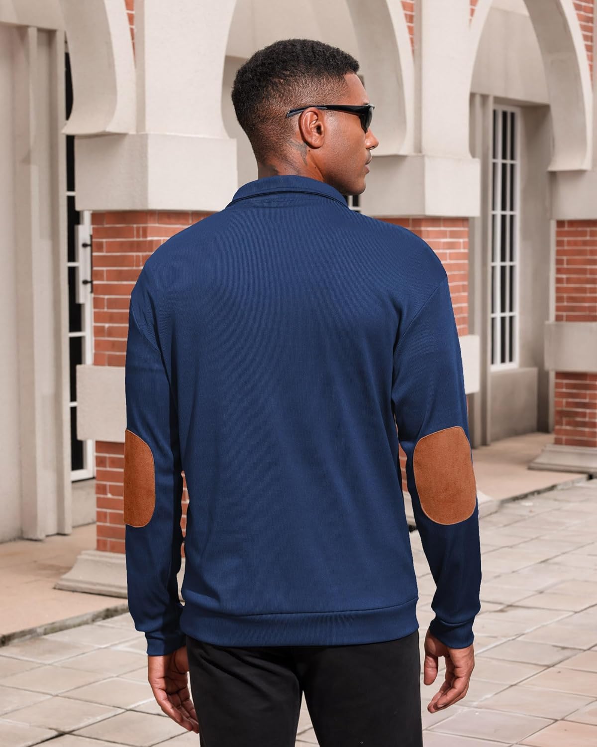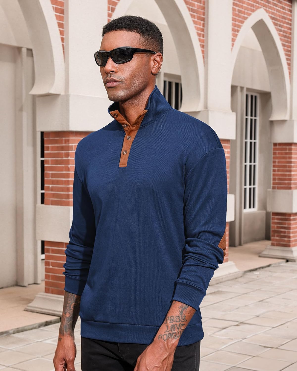 - Design: Features long sleeves, a button-up neck, and a stand collar. The collar and elbows are accented with suede patches, and it includes high-quality button closures.