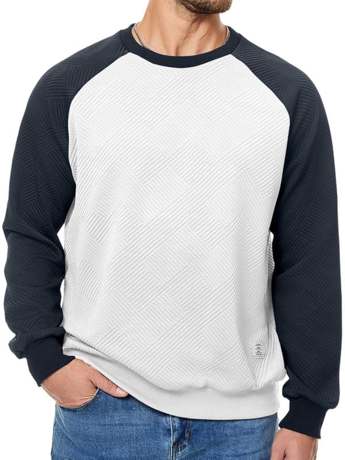 About Men’s Fall Crewneck Sweatshirts Patchwork Long Sleeve Geometric Texture Casual Pullover Shirt