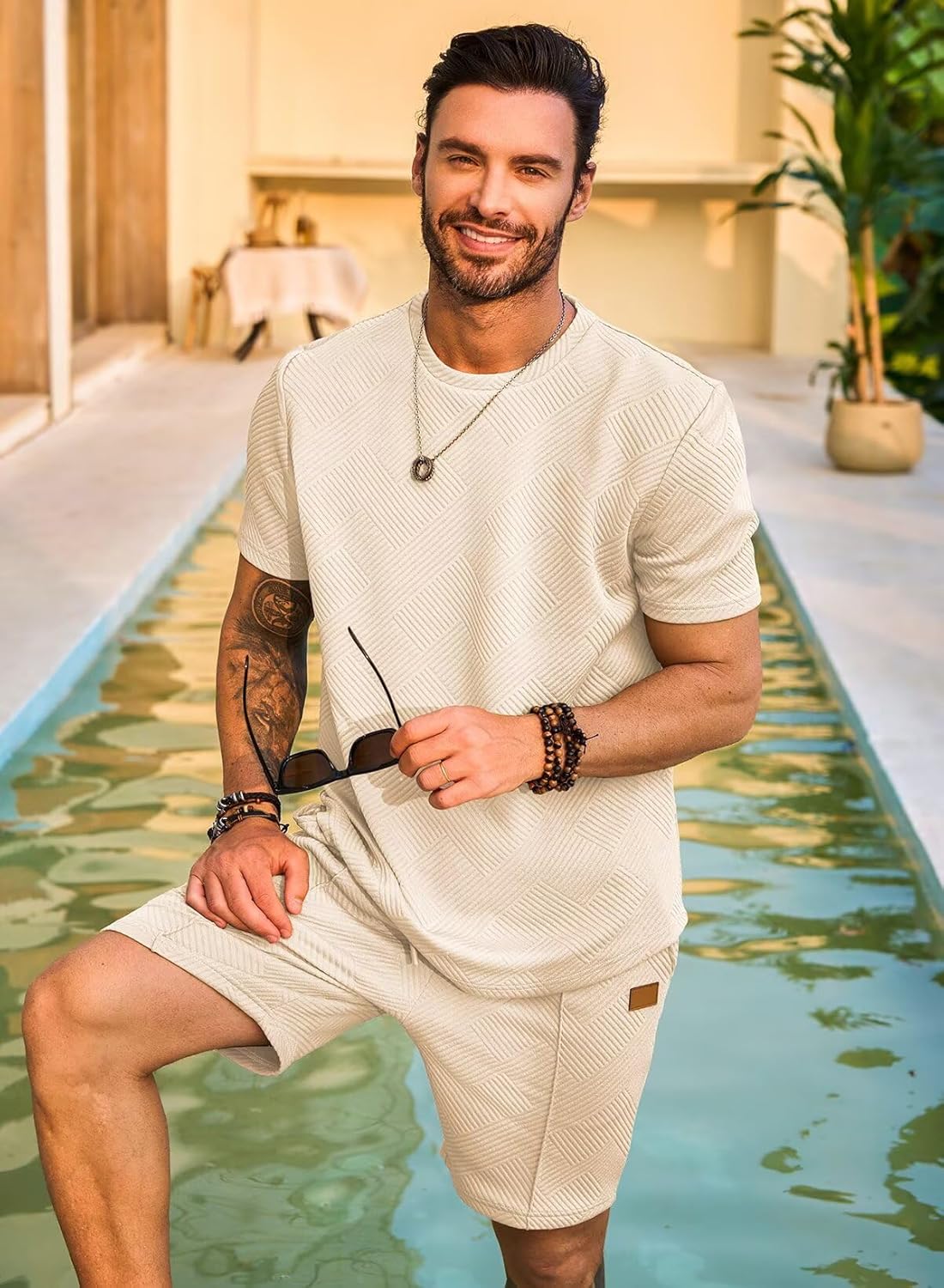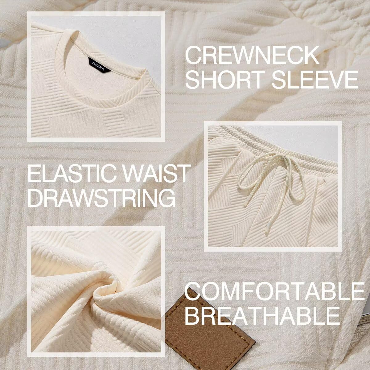 - Classic Style: Men’s 2 piece short sets outfits features a regular fit, classic crew neck and short sleeves design. The shorts feature an elastic waist drawstring for an effortlessly custom fit, and their chic geometric texture and classic solid colors make them timeless.