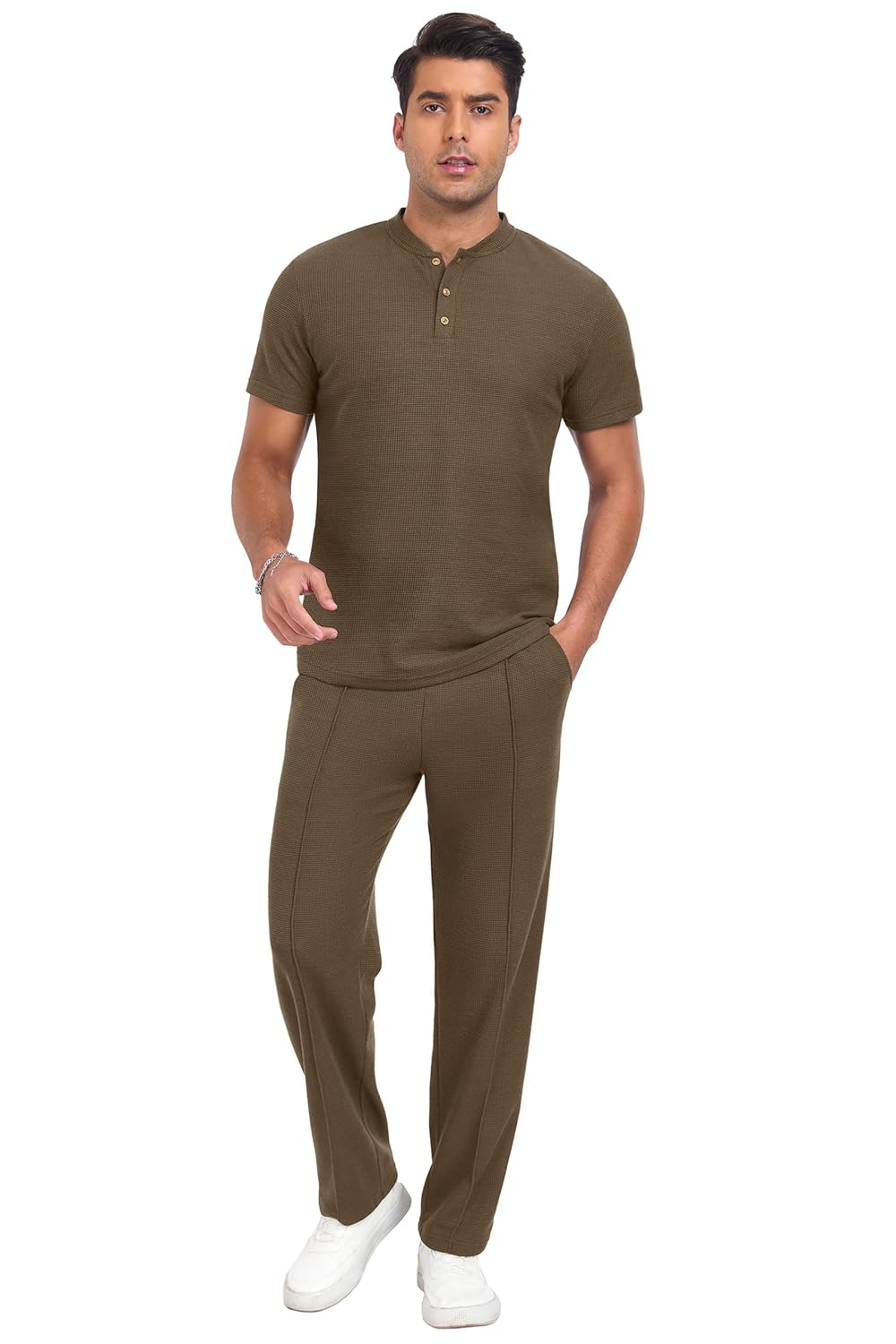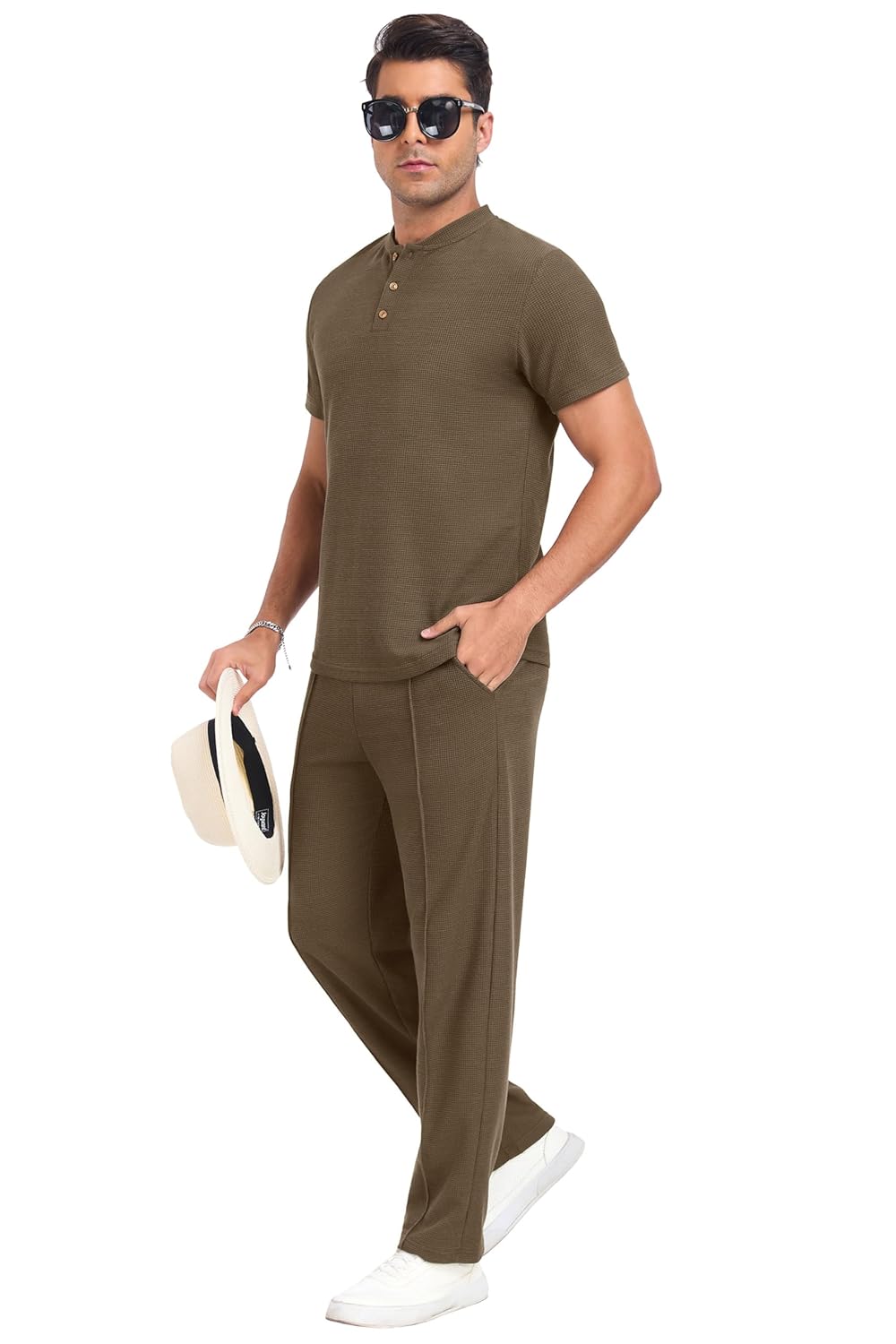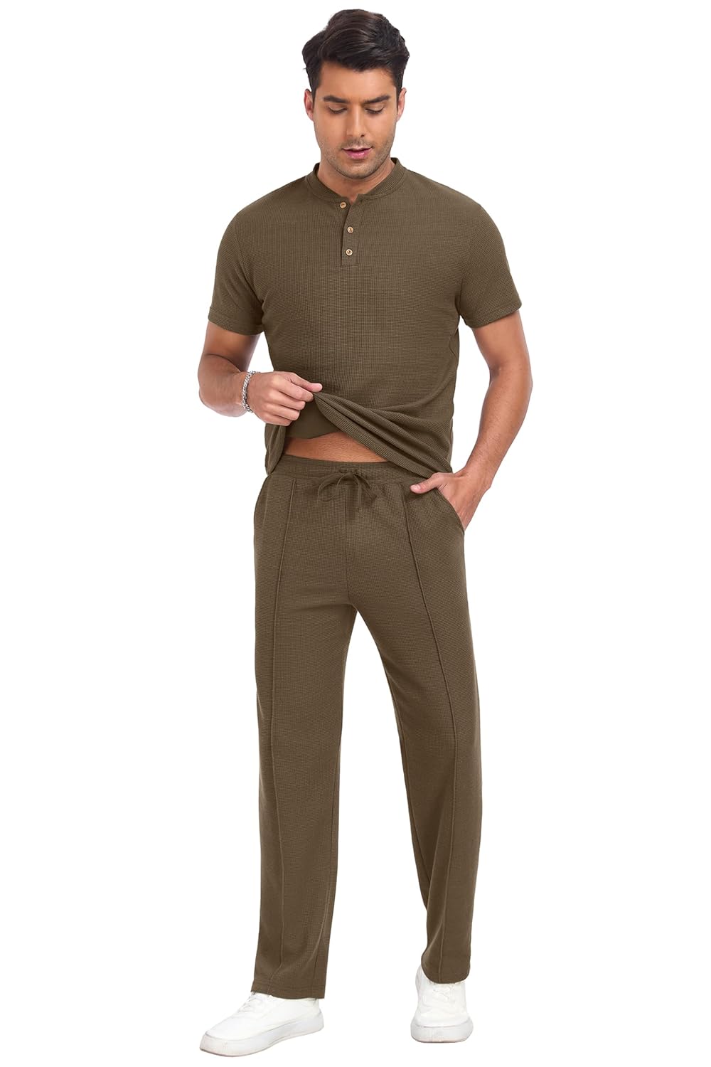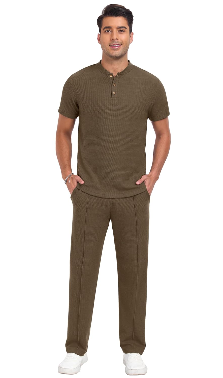 Photos: PrinStory Men’s Short Sleeve Outfits Waffle Knit Henley Shirt and Pants Set Casual 2 Pieces Summer Tracksuits with Pockets by PrinStory