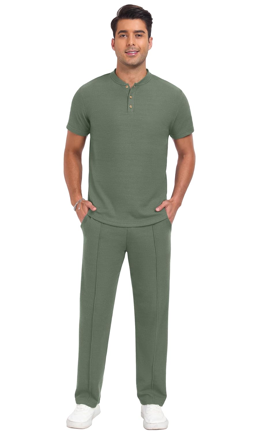 Photos: PrinStory Men’s Short Sleeve Outfits Waffle Knit Henley Shirt and Pants Set Casual 2 Pieces Summer Tracksuits with Pockets by PrinStory