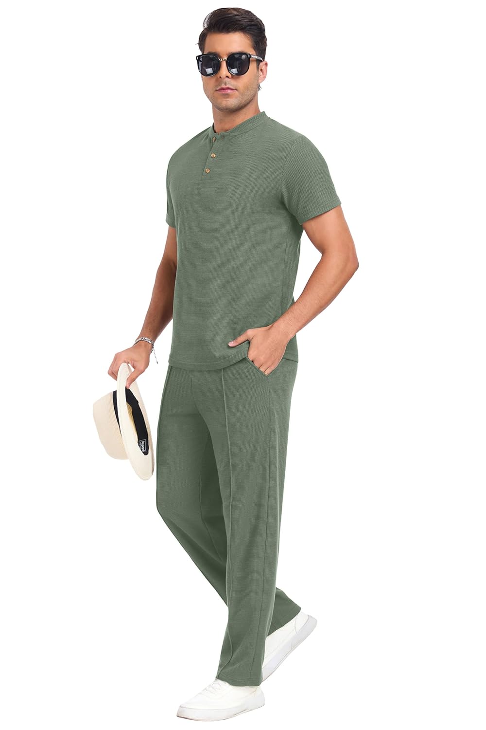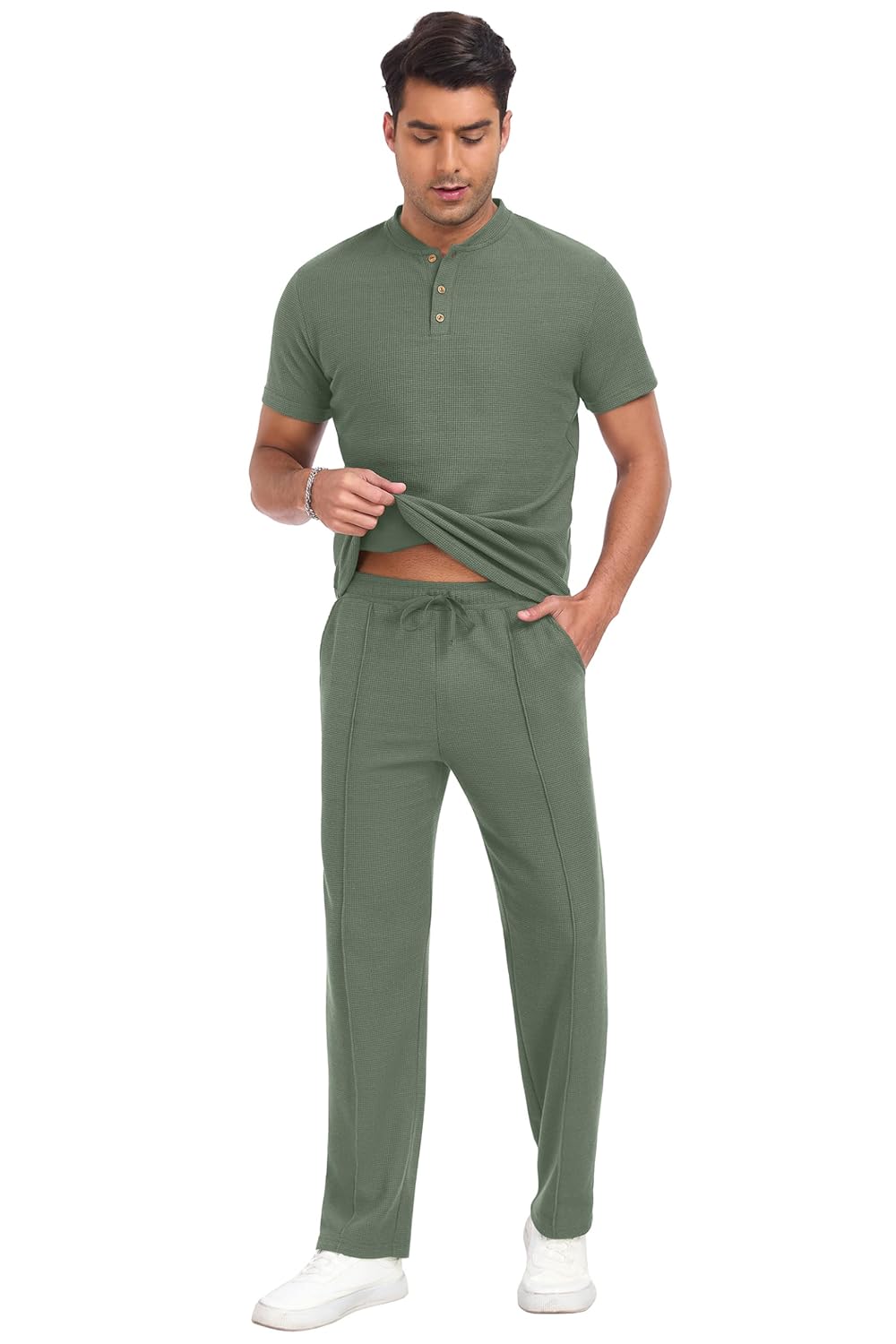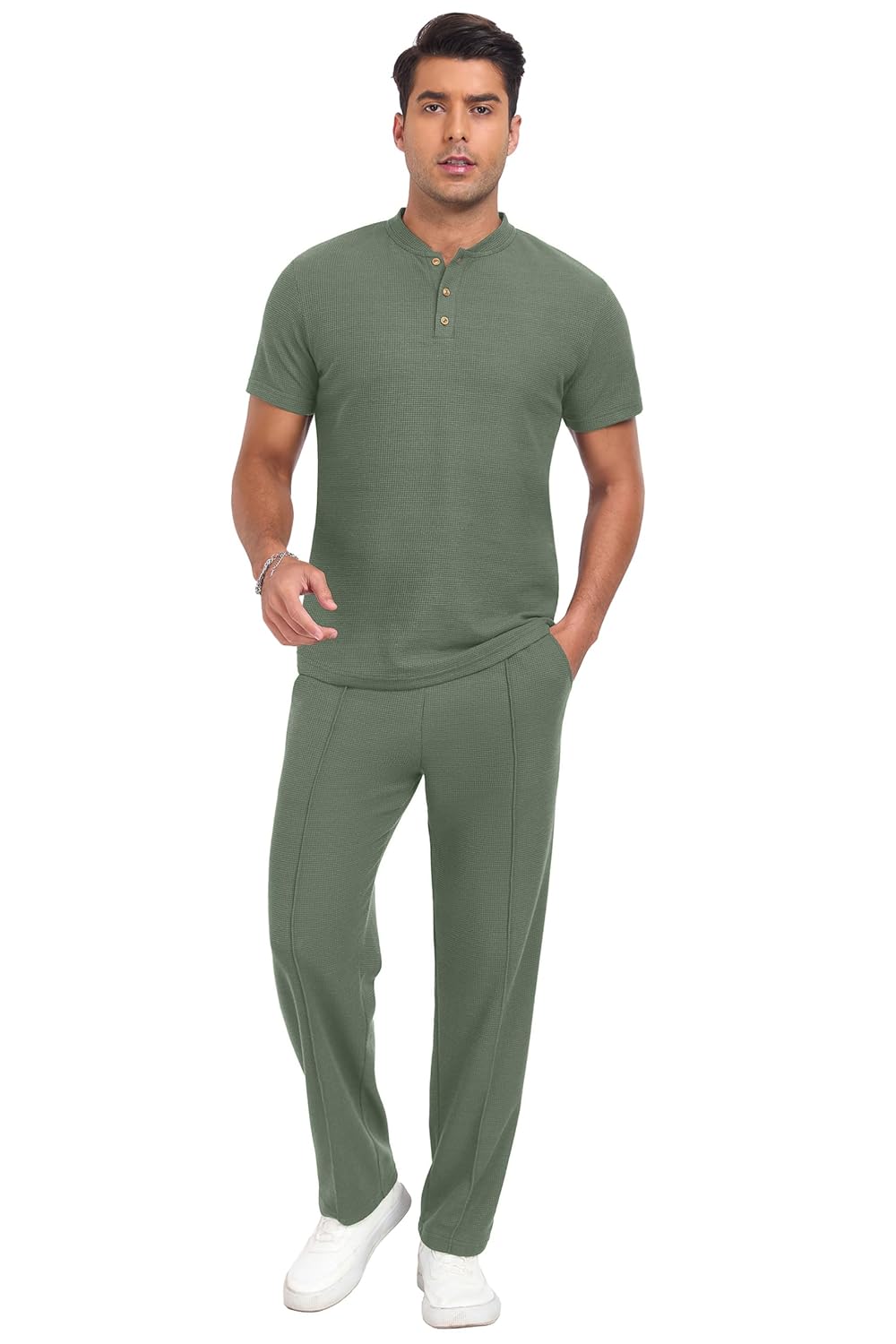 - 2 Pieces Sets: Men’s summer shirt features a modern henley shirt with short sleeves. Matching pants include an elastic waistband with drawstring and dual side pockets for essentials