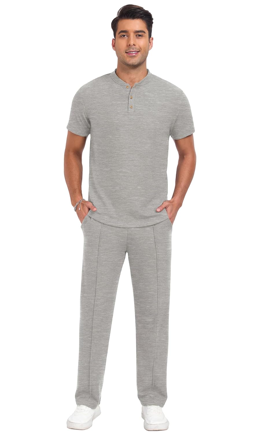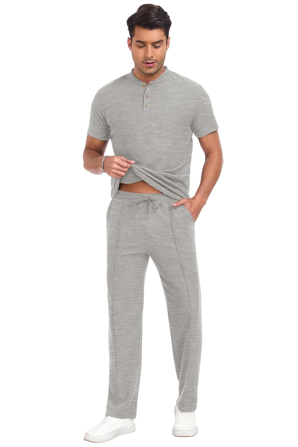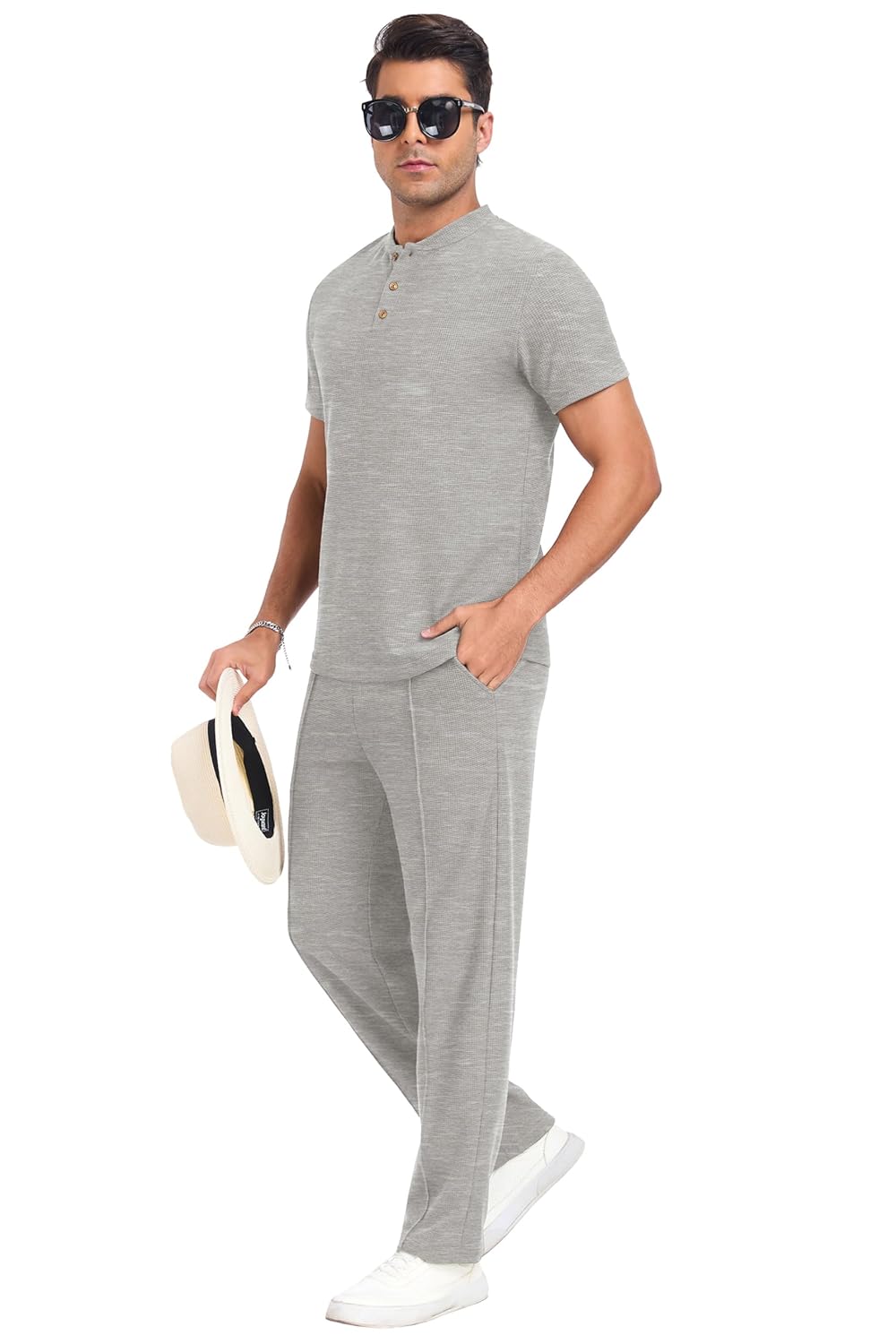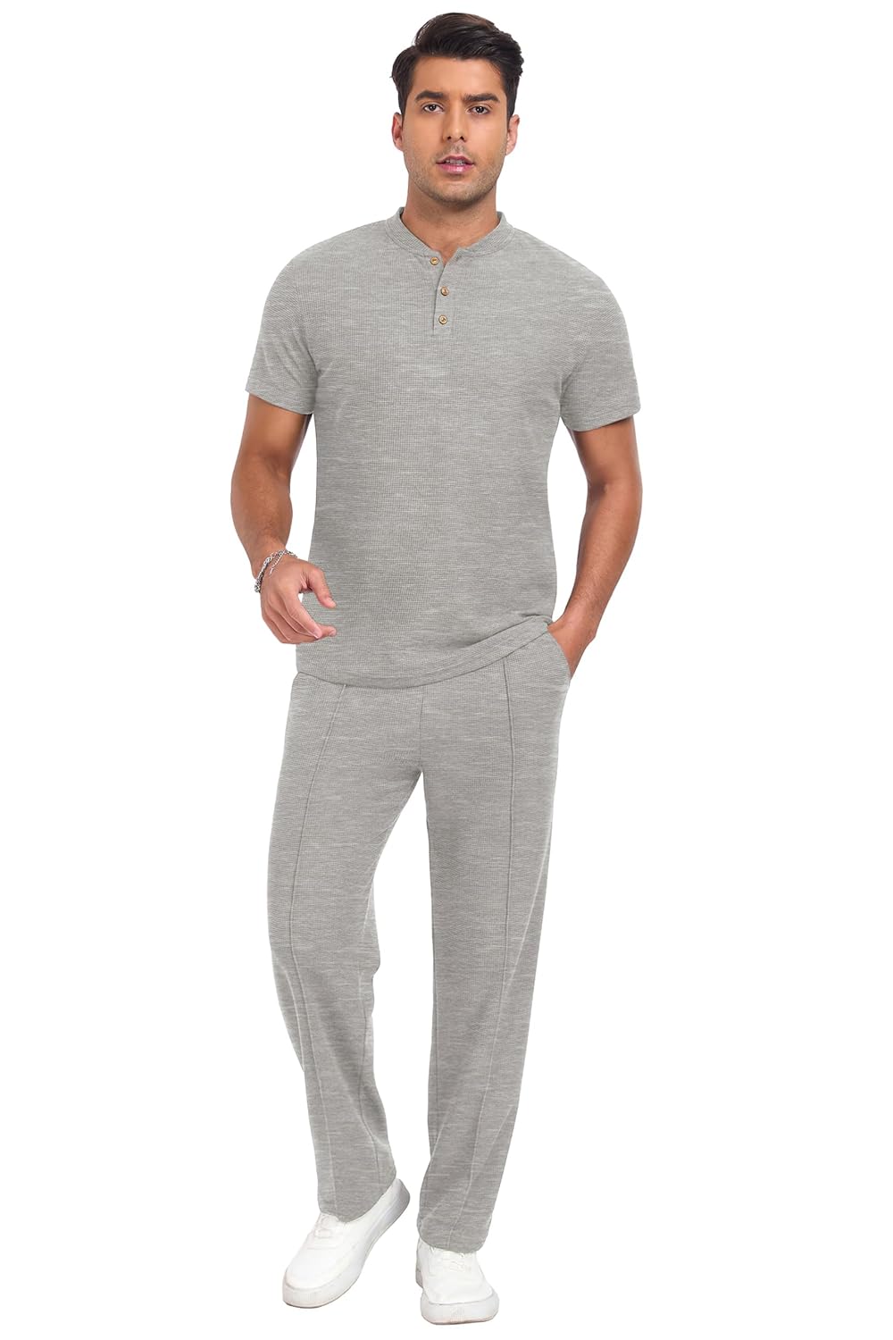 - 2 Pieces Sets: Men’s summer shirt features a modern henley shirt with short sleeves. Matching pants include an elastic waistband with drawstring and dual side pockets for essentials