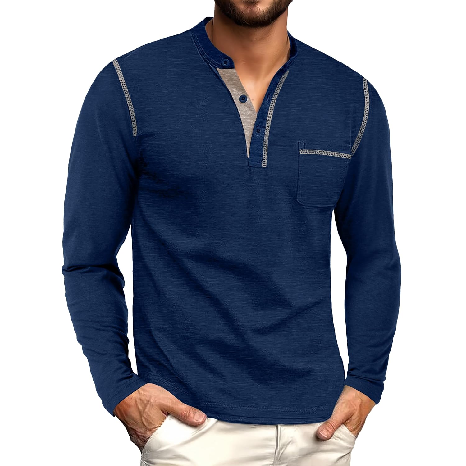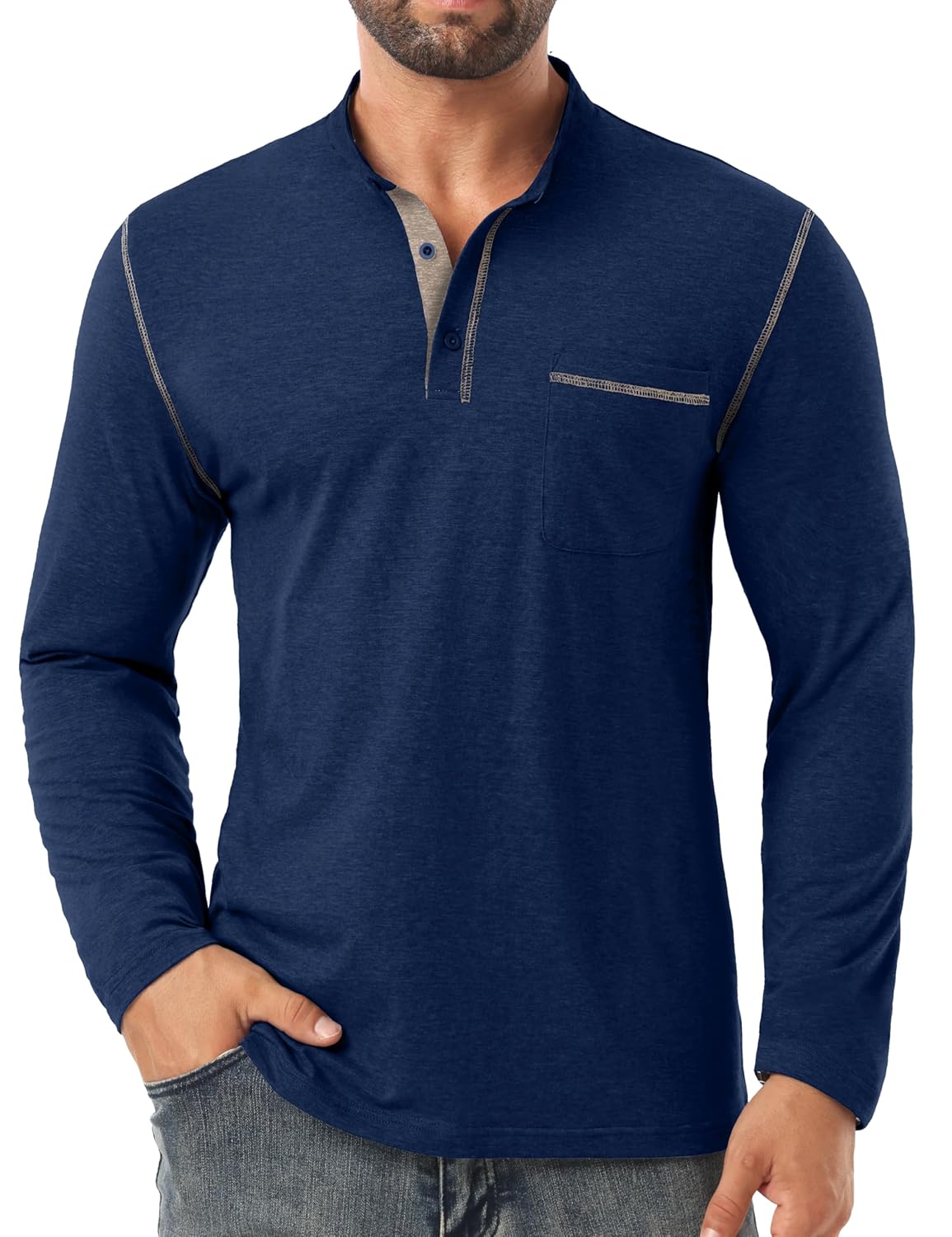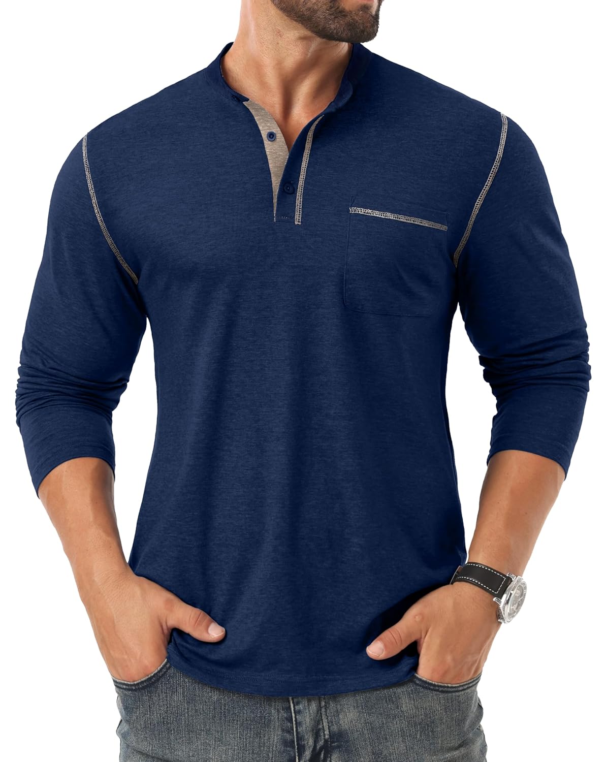 - Classic Henley Tee:Color contrast long sleeve henley with a 3 button placket and chest pocket. Made with sturdy stitching for a clean, casual look. A timeless wardrobe essential.
