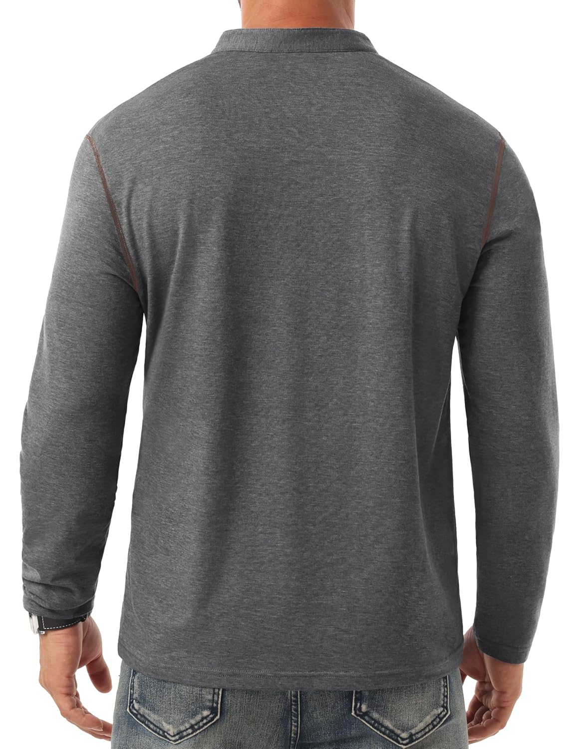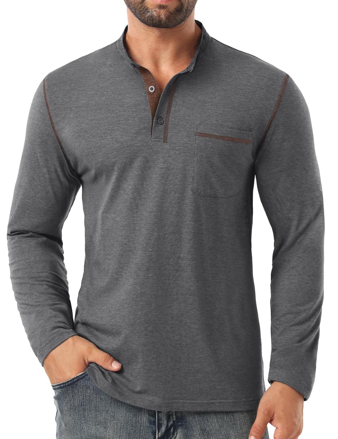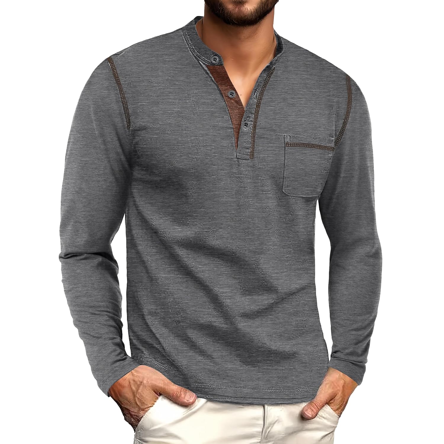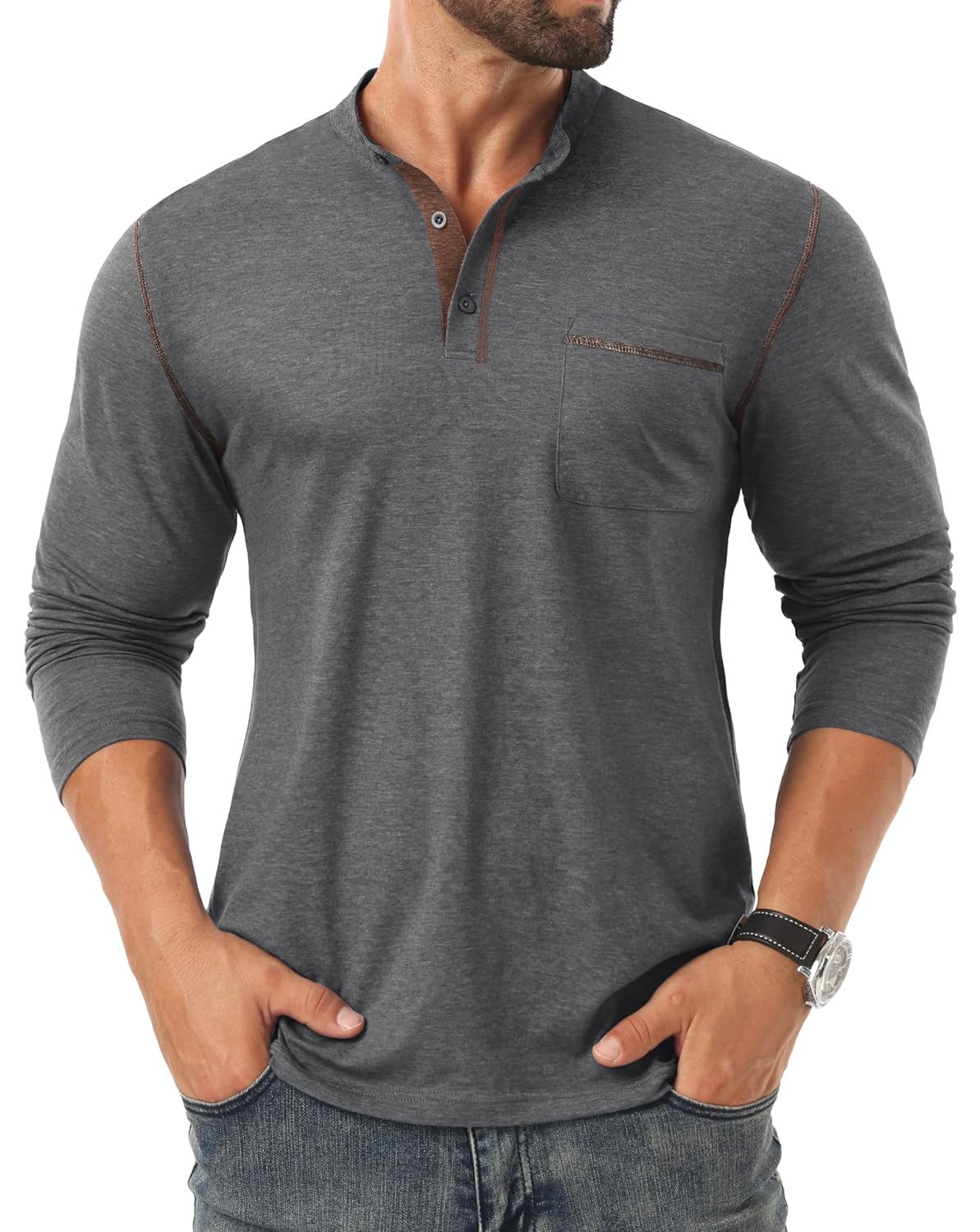 - Classic Henley Tee:Color contrast long sleeve henley with a 3 button placket and chest pocket. Made with sturdy stitching for a clean, casual look. A timeless wardrobe essential.