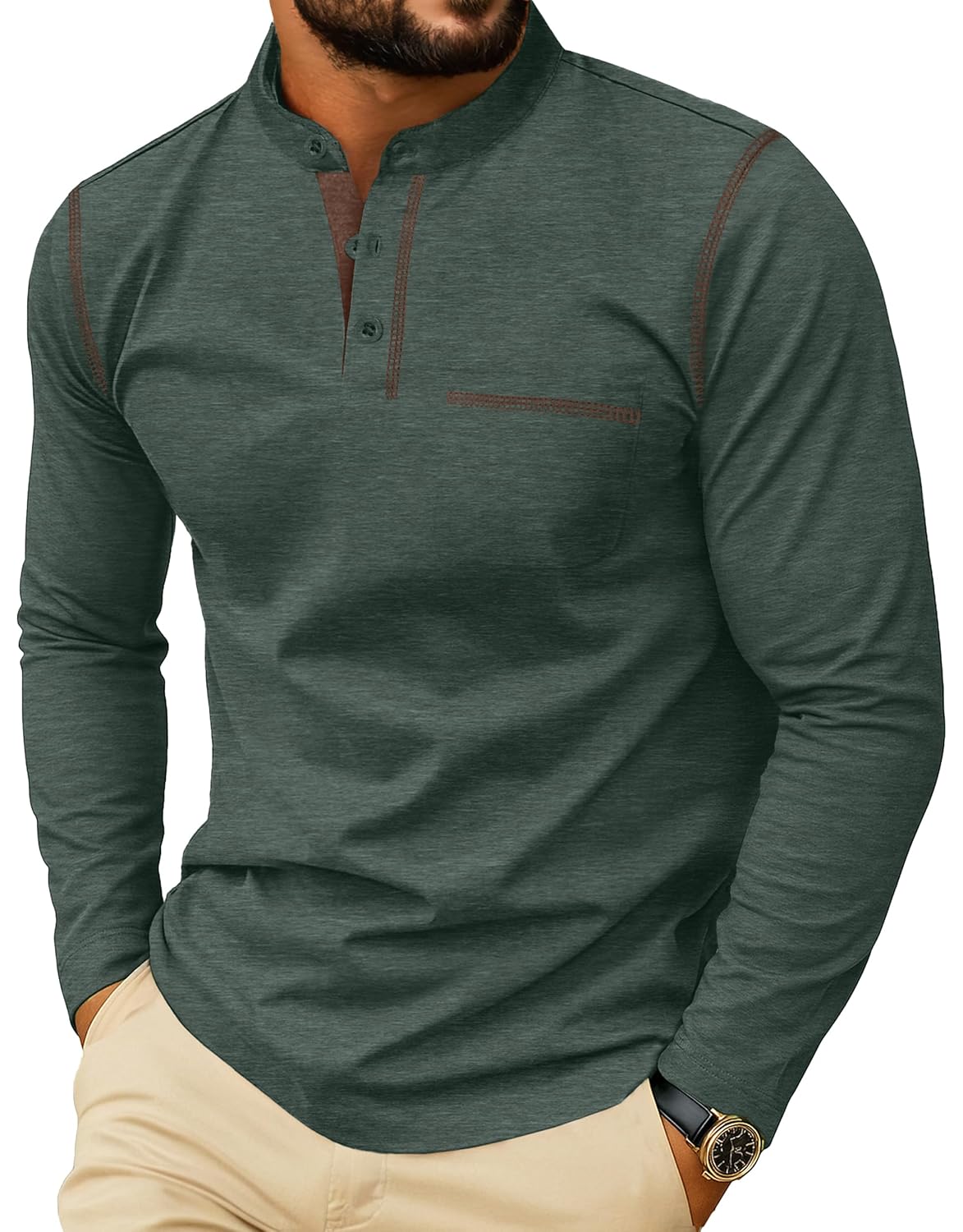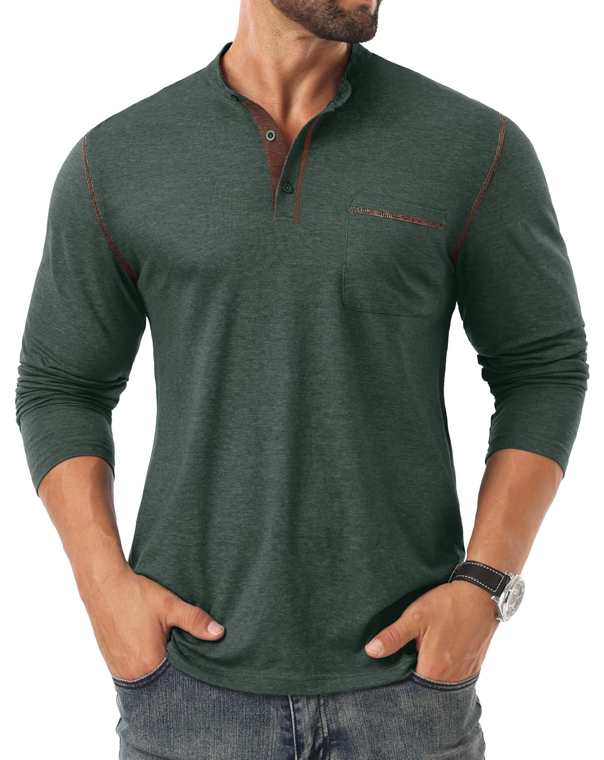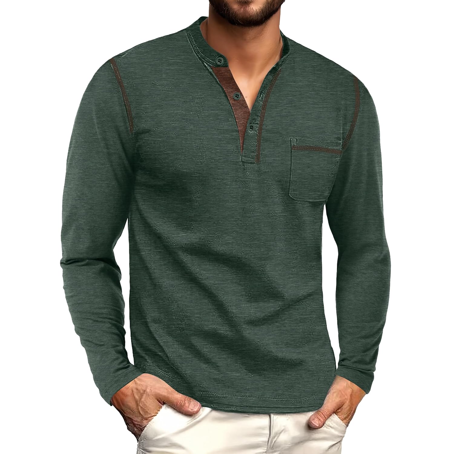 - Classic Henley Tee:Color contrast long sleeve henley with a 3 button placket and chest pocket. Made with sturdy stitching for a clean, casual look. A timeless wardrobe essential.