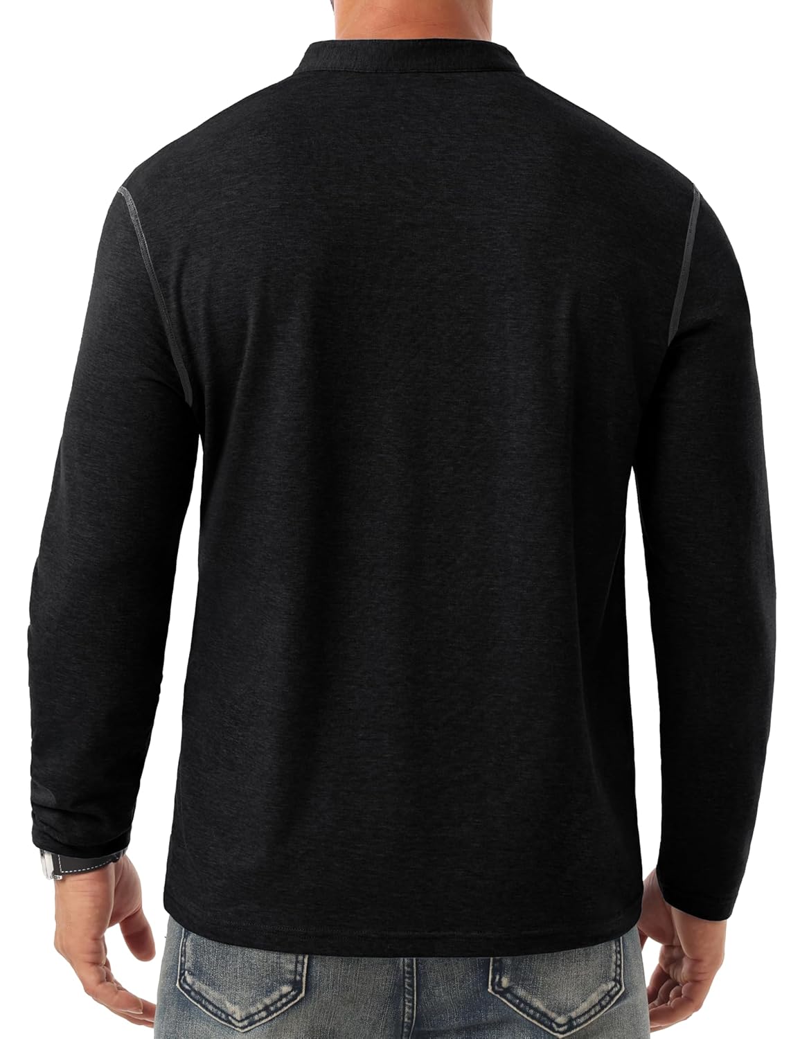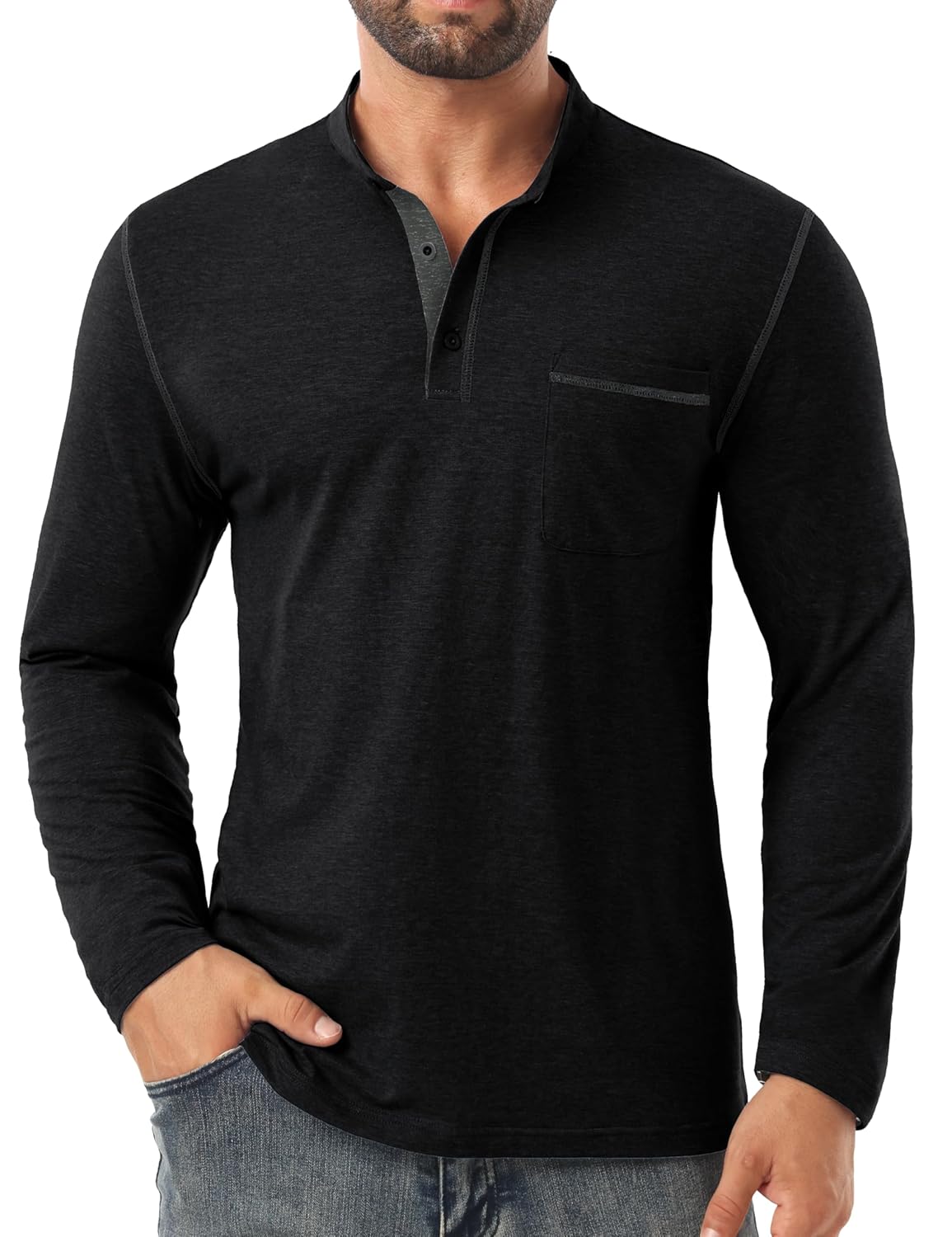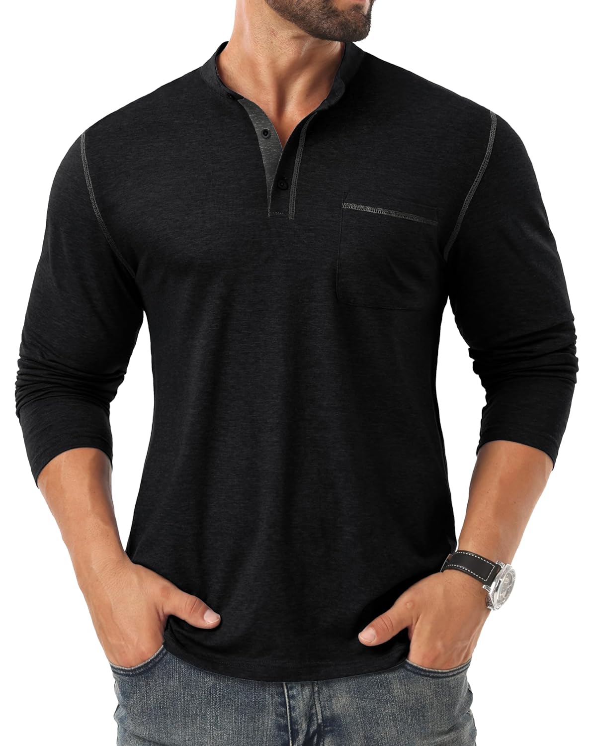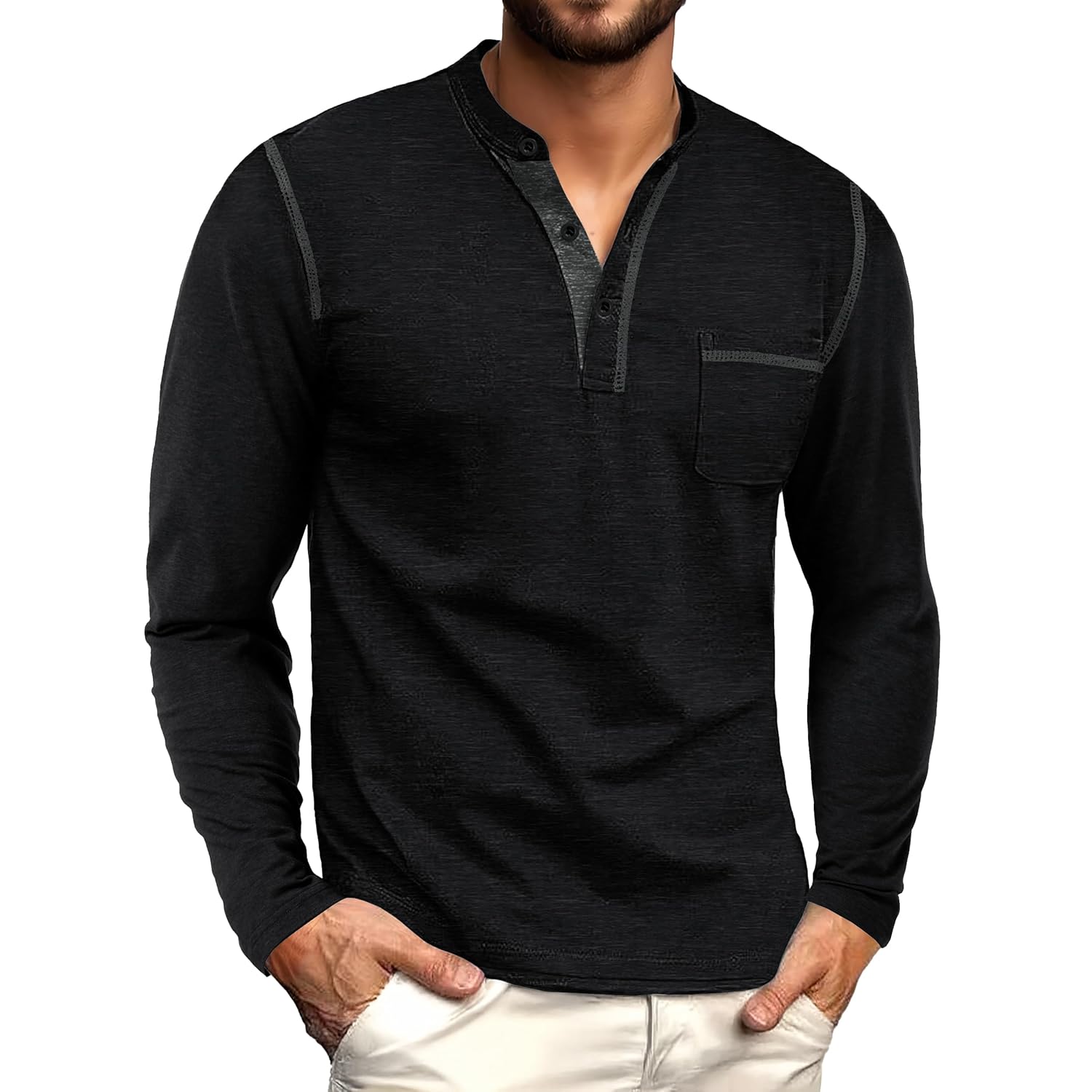 - Classic Henley Tee:Color contrast long sleeve henley with a 3 button placket and chest pocket. Made with sturdy stitching for a clean, casual look. A timeless wardrobe essential.