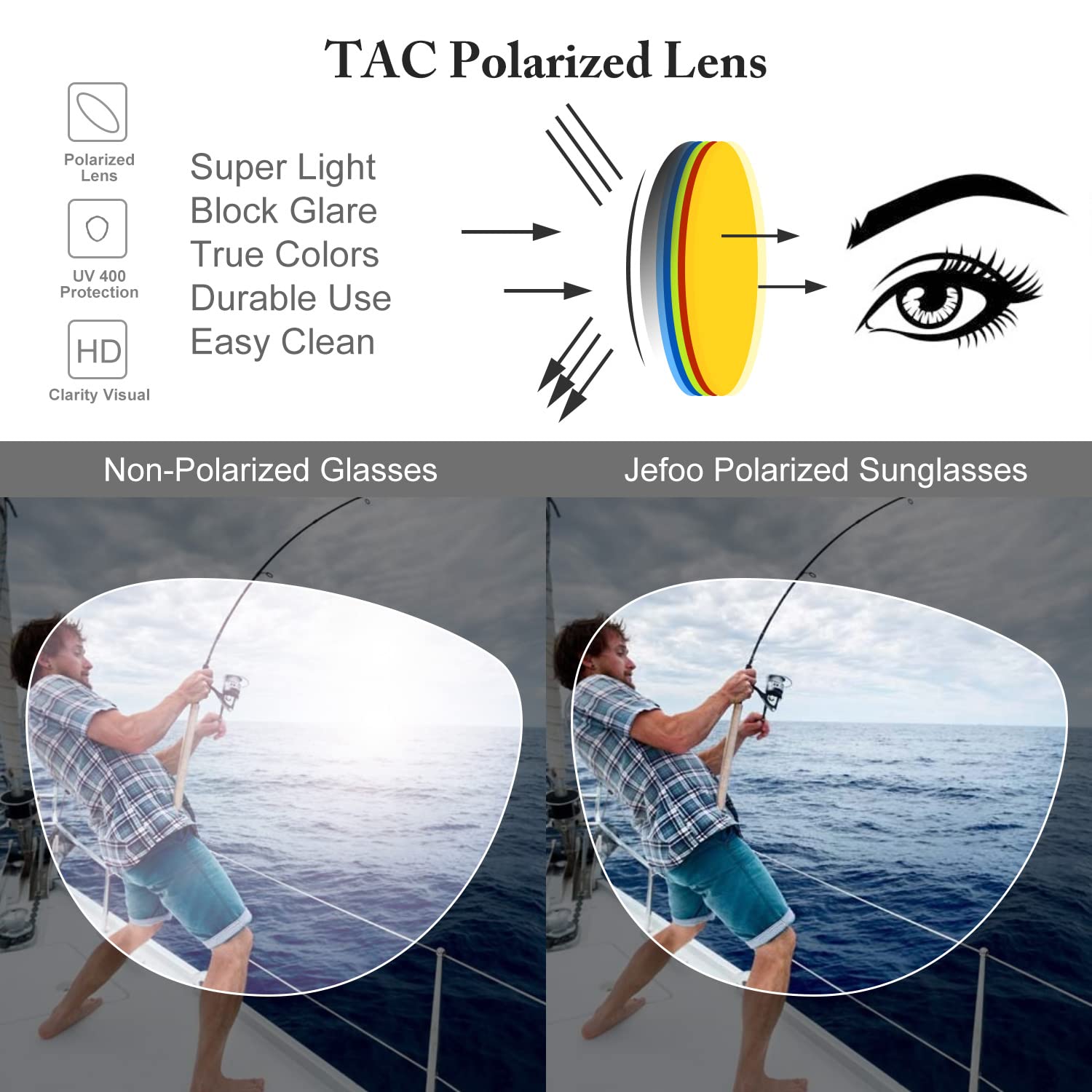 - POLARIZED & UV PROTECTION : Jefoo polarized UV protection glasses can not only reduce the glare produced by the reflection of the sun’s rays, improve visual clarity and contrast, so that your eyes can relax even in the sun, but also protect your eyes from harmful solar UV rays. Whether you are driving to work or enjoying sunbathing outdoors, you can enjoy every detail of the world without worrying about the health of your eyes.