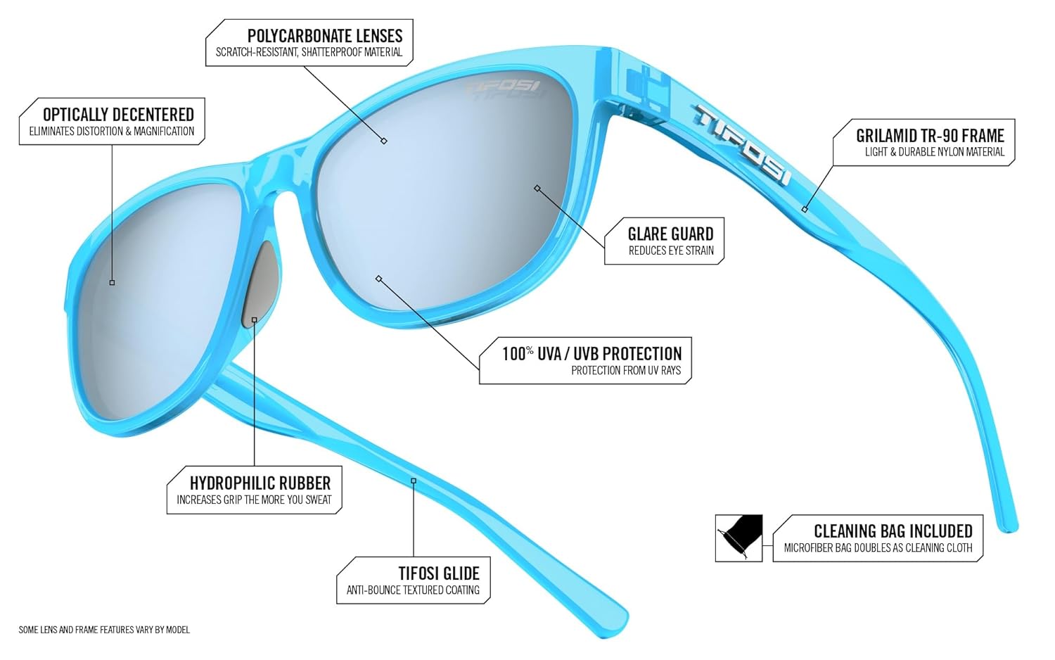- FRAME TECHNOLOGY โค Integrated hinge never pulls hair, hydrophilic nose pads for increased gripping, and Tifosi Glide technology allows the frame to slide on comfortably and provide a no-slip fit