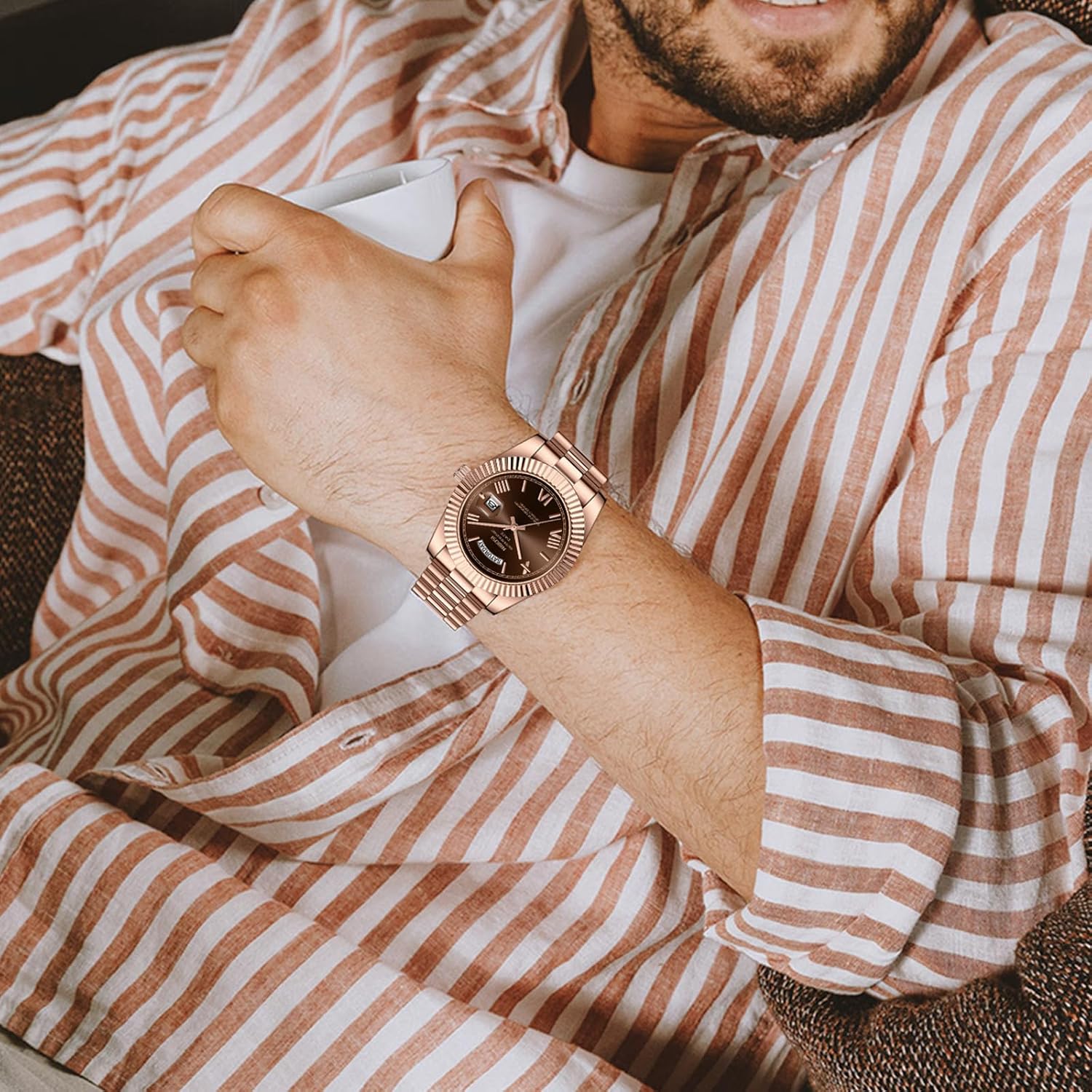 - [Premium Luxury Materials] This men’s rose gold watch is crafted with a solid stainless steel case (0.51-inch thick) with a 0.75-inch width bracelet. Push button foldover clasp prevents accidental openings. Includes an adjustment tool that customizes a 7.09-8.66-inch fit for most wrists. Sturdy 4 oz weight conveys premium quality