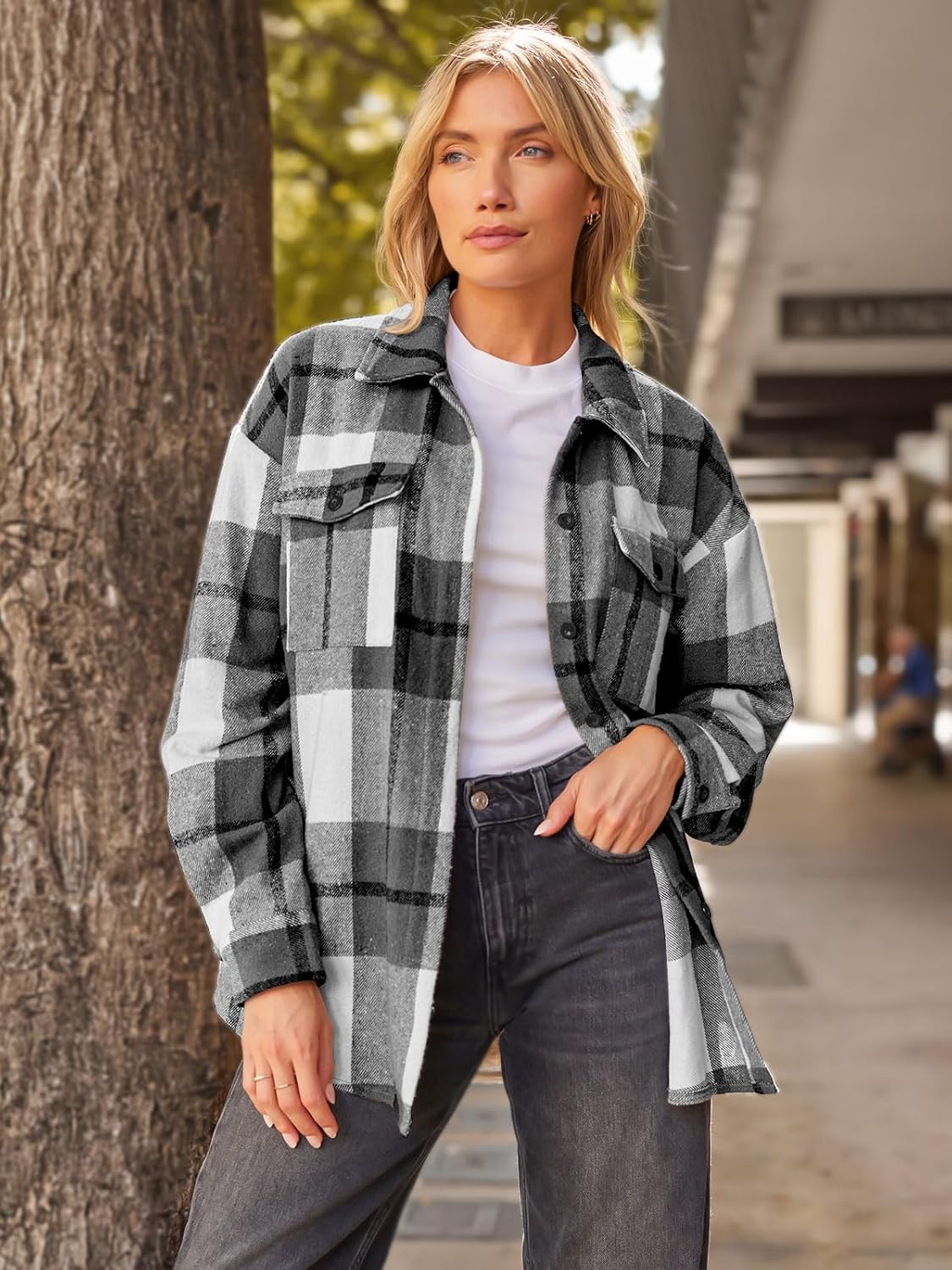 This shacket is incredibly versatile and stylish. The flannel plaid material is super soft and cozy, perfect for those crisp fall days. It’s thick enough to provide warmth like a light jacket but still comfortable enough to wear as a shirt. The button-down design and long sleeves give it a classic, laid-back look that’s effortlessly chic.