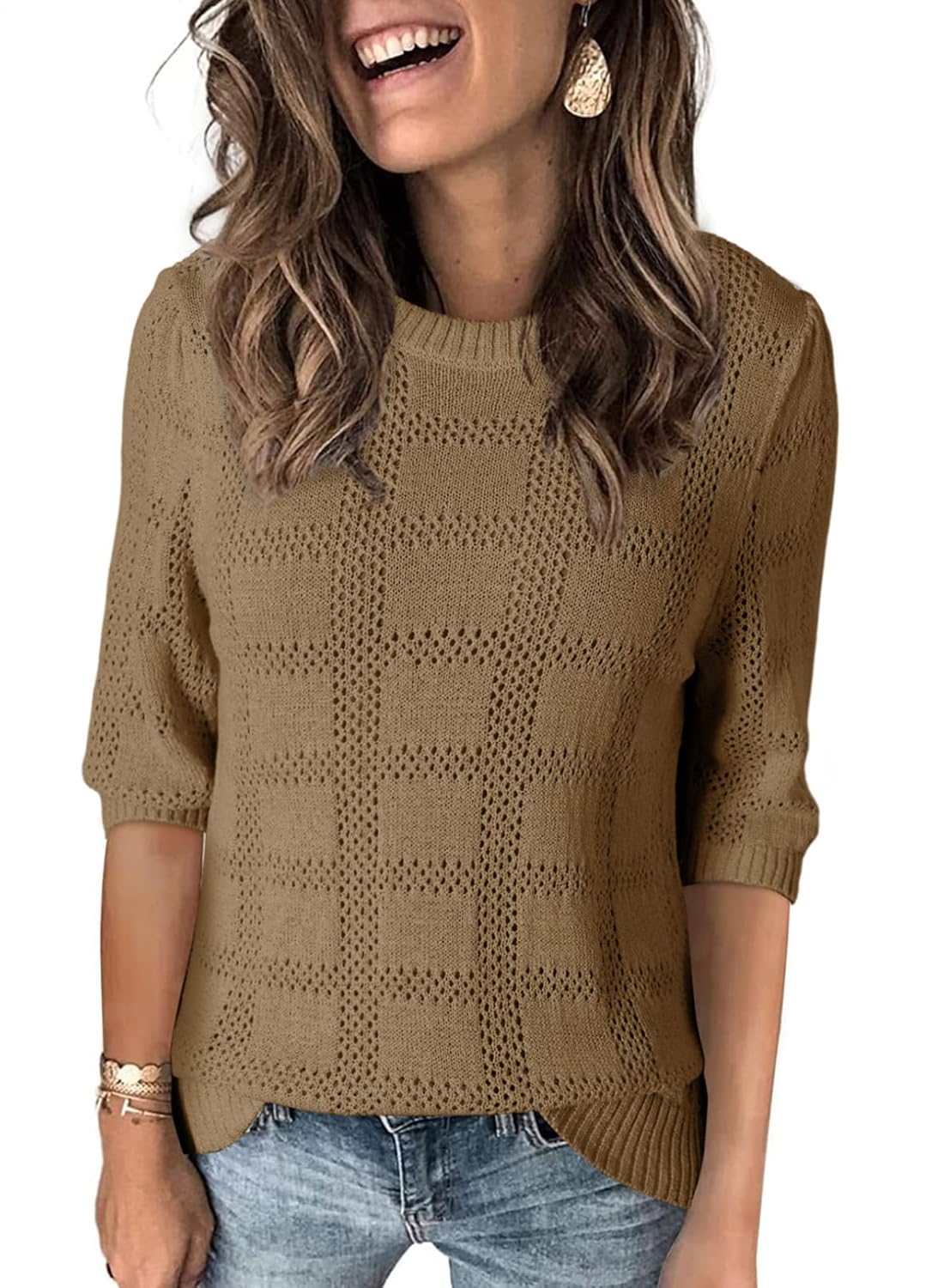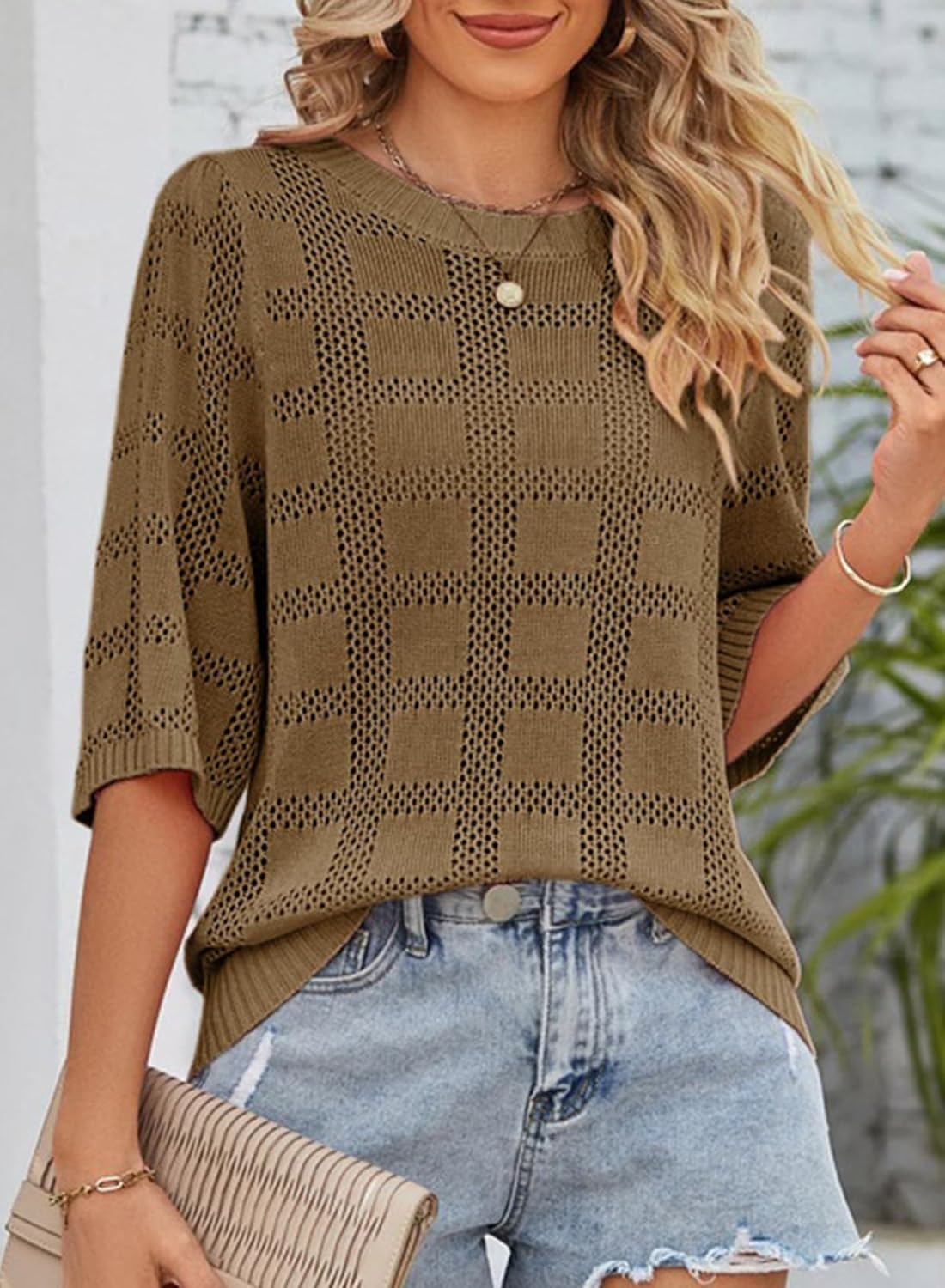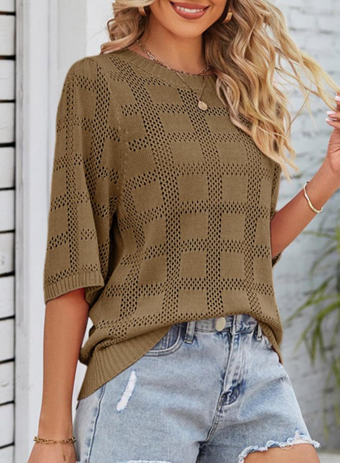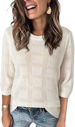 - Feature: Half Short Sleeve Tops for Women, Solid Color, Basic Tunic Tops, Women Knit T Shirts, CrewneckTunic Shirt for Women, Unique Knitting Pattern, Elsey Crochet Top, Loose Fit Pullover Top, Relaxed Fit.