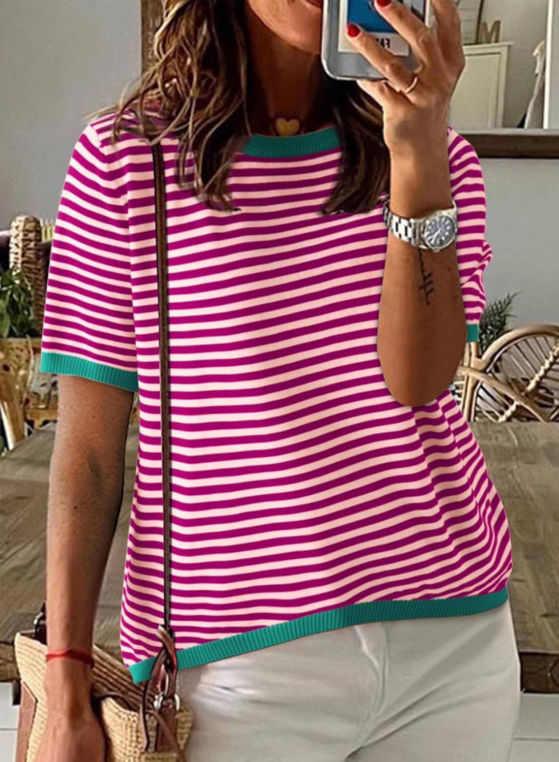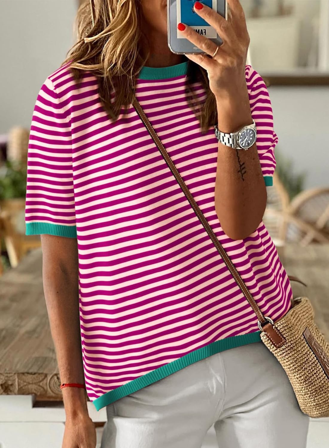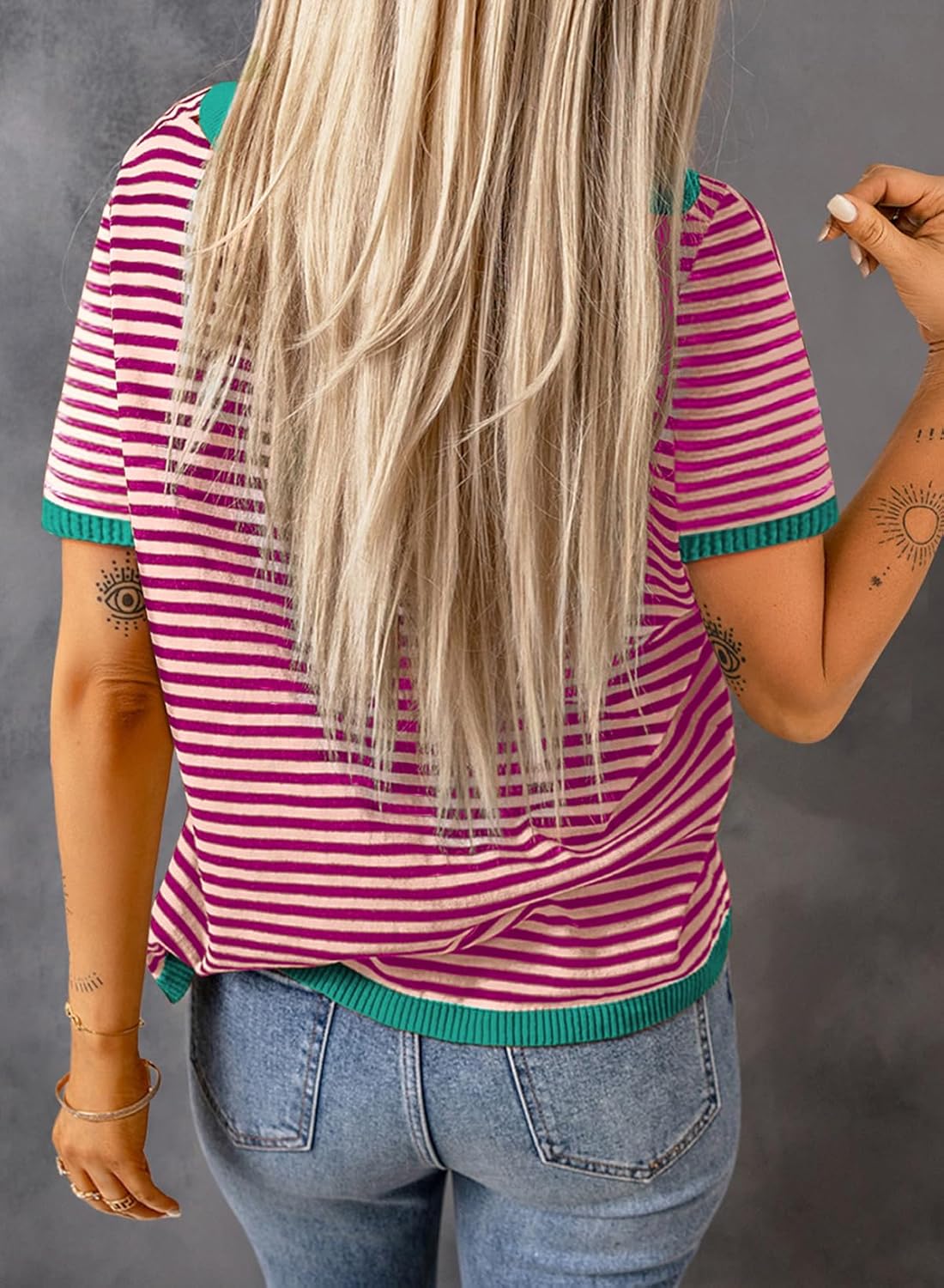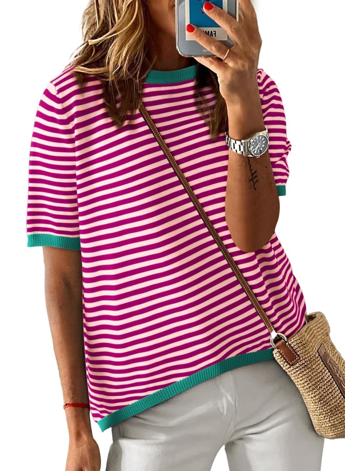 Photos: Dokotoo Womens Tops Casual Summer Crewneck Short Sleeve Striped Color Block Knit High Low Trendy Pullover Sweaters by Dokotoo