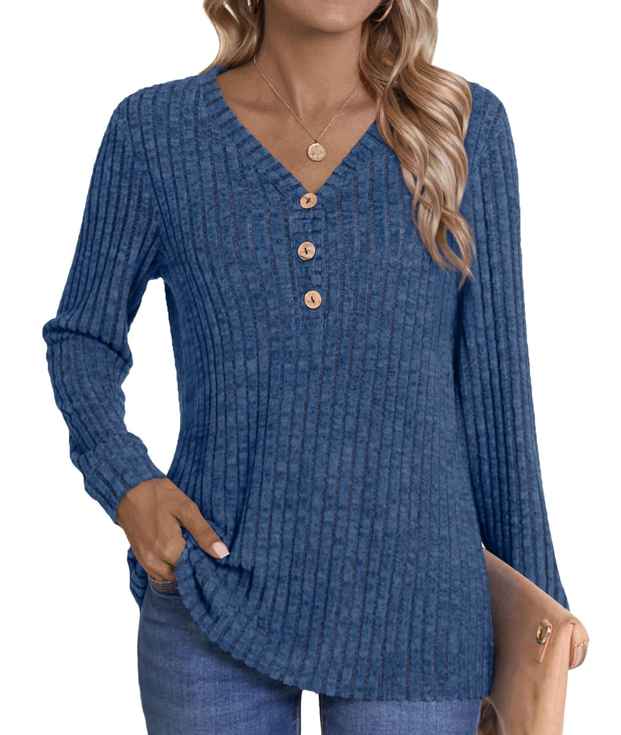 - Features: Long sleeve, v-neck, three buttons, screw cuff, on the hip length, warm, plain and elegant