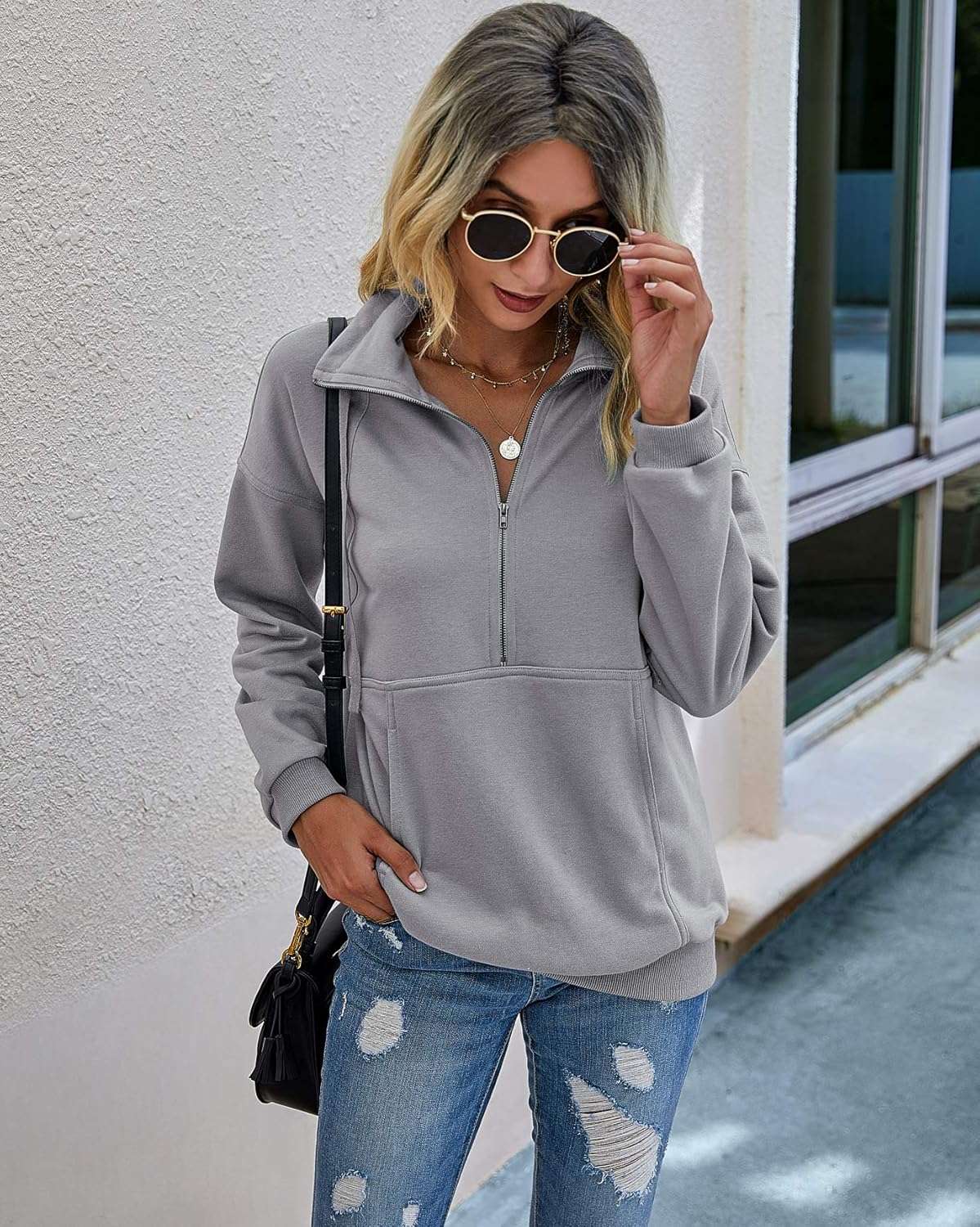 - Features: Half zip pullover women, Solid color cute sweatshirts for women, Lapel half zip up sweatshirt women, Womens sweatshirt no hood, Long Sleeve pullover sweatshirts for women, Ribbed cuffs, 1 front big pocket, Oversized sweatshirt for women, Soft zipper fall sweatshirts for women loose fit, Casual womens sweatshirts no hood, Drawstring neck womens oversized sweatshirts, Quarter zip pullover women