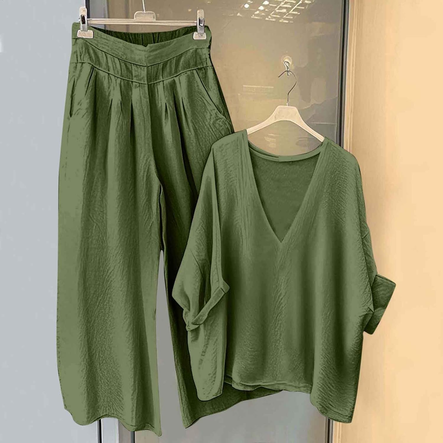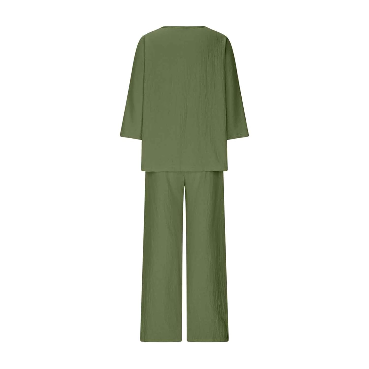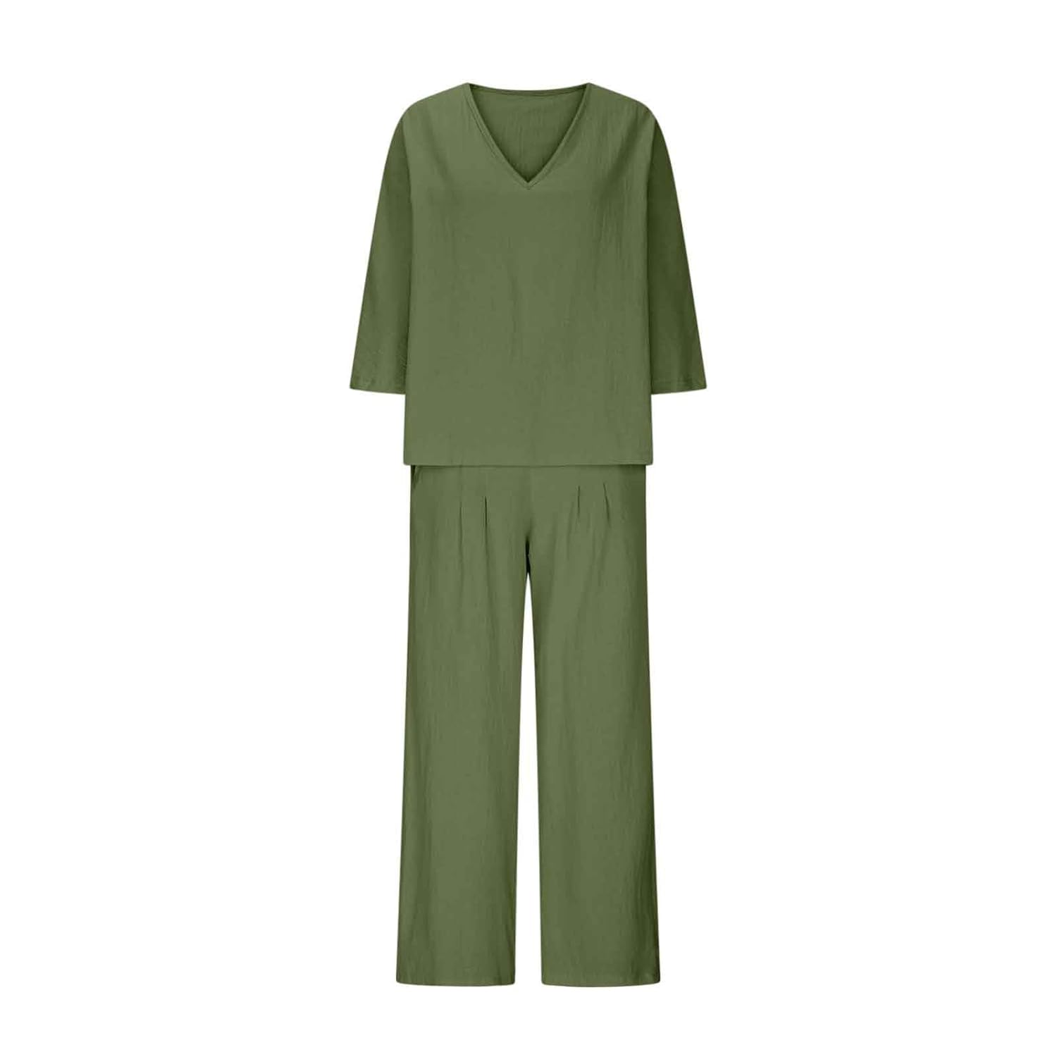 Sinzelimin Women Cotton Linen Outfits Solid V-Neck Long Sleeves Oversized Shirts Tops Loose Comfy Wide Leg Capri Pant 2PC Set by Sinzelimin