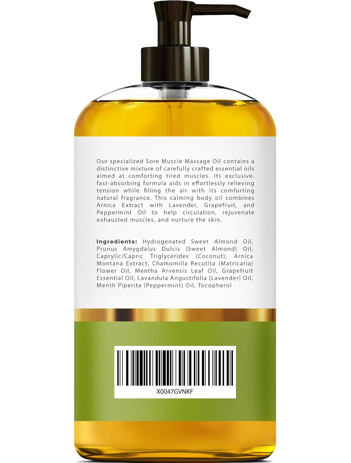 - SORE MUSCLE MASSAGE OIL FOR MASSAGE THERAPY – Our 100% Natural formula, expertly crafted to help alleviate tired, aching muscles. With its easy absorption and natural aroma, this oil helps eases tension while leaving your skin feeling deeply nourished and moisturized.