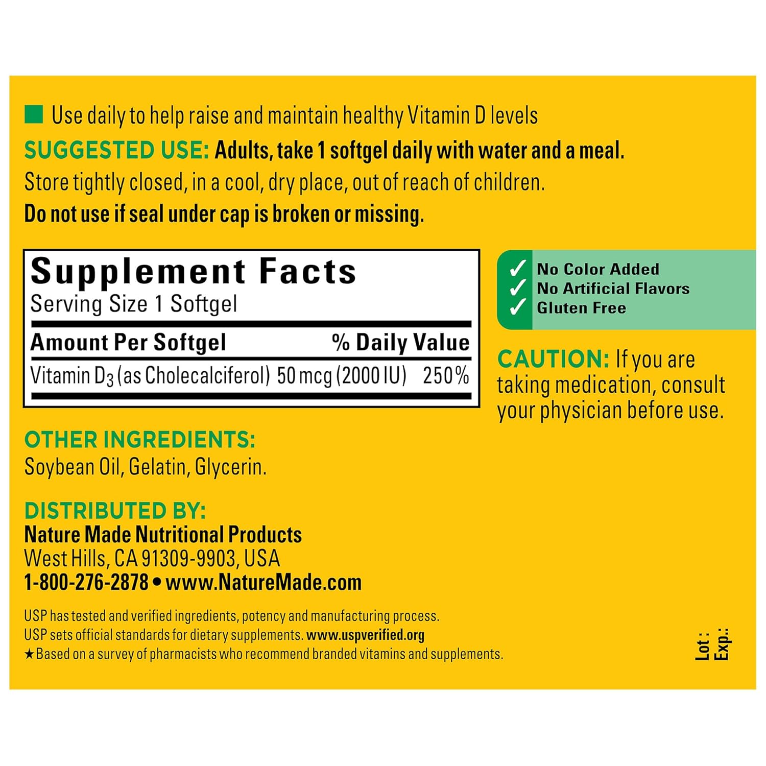 Specification: Nature Made Vitamin D3 2000 IU (50 mcg), Vitamin D Supplement for Bone, Teeth, Muscle and Immune Health Support, 250 Softgels, 250 Day Supply by Nature Made
