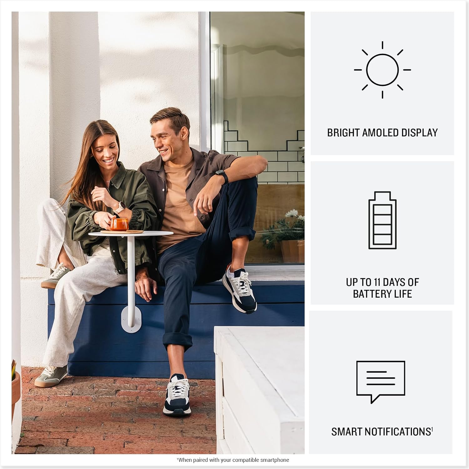 - Designed with a bright AMOLED display, get a more complete picture of your health, thanks to battery life of up to 11 days in smartwatch mode