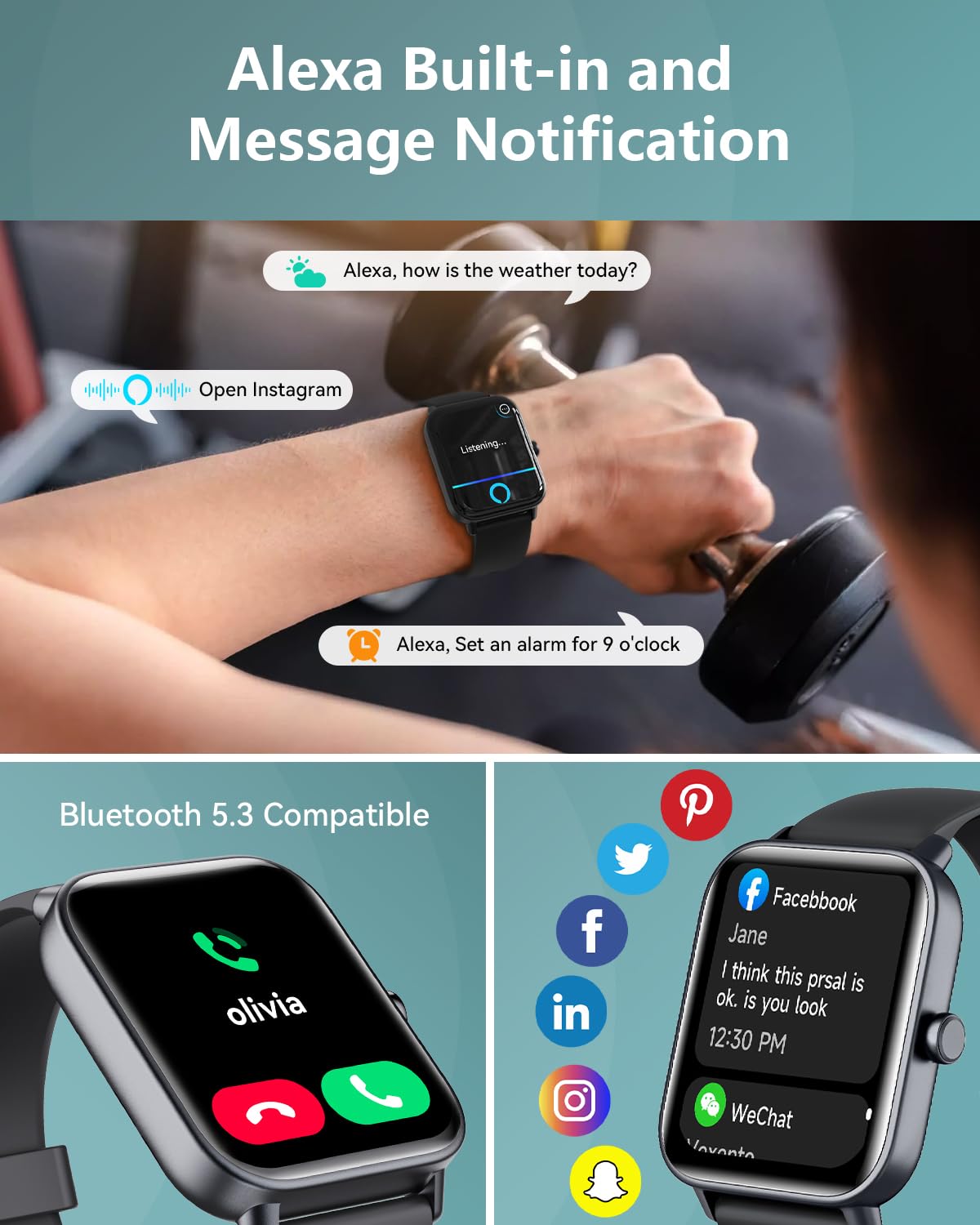 - 【Bluetooth 5.3 Call & Alexa Voice Control 】The Upgraded smart watches for men(women) is equipped with built-in hd speaker, with Bluetooth 5.3, you can answer/make calls directly from your smart watches when your phone is out of reach, and you can also view your call history, frequent contacts, and dial-up calls. Fitness tracker smartwatches work with Alexa, you can inquire about news, weather, set alarms, helping us to live more conveniently, smarter, and healthier.