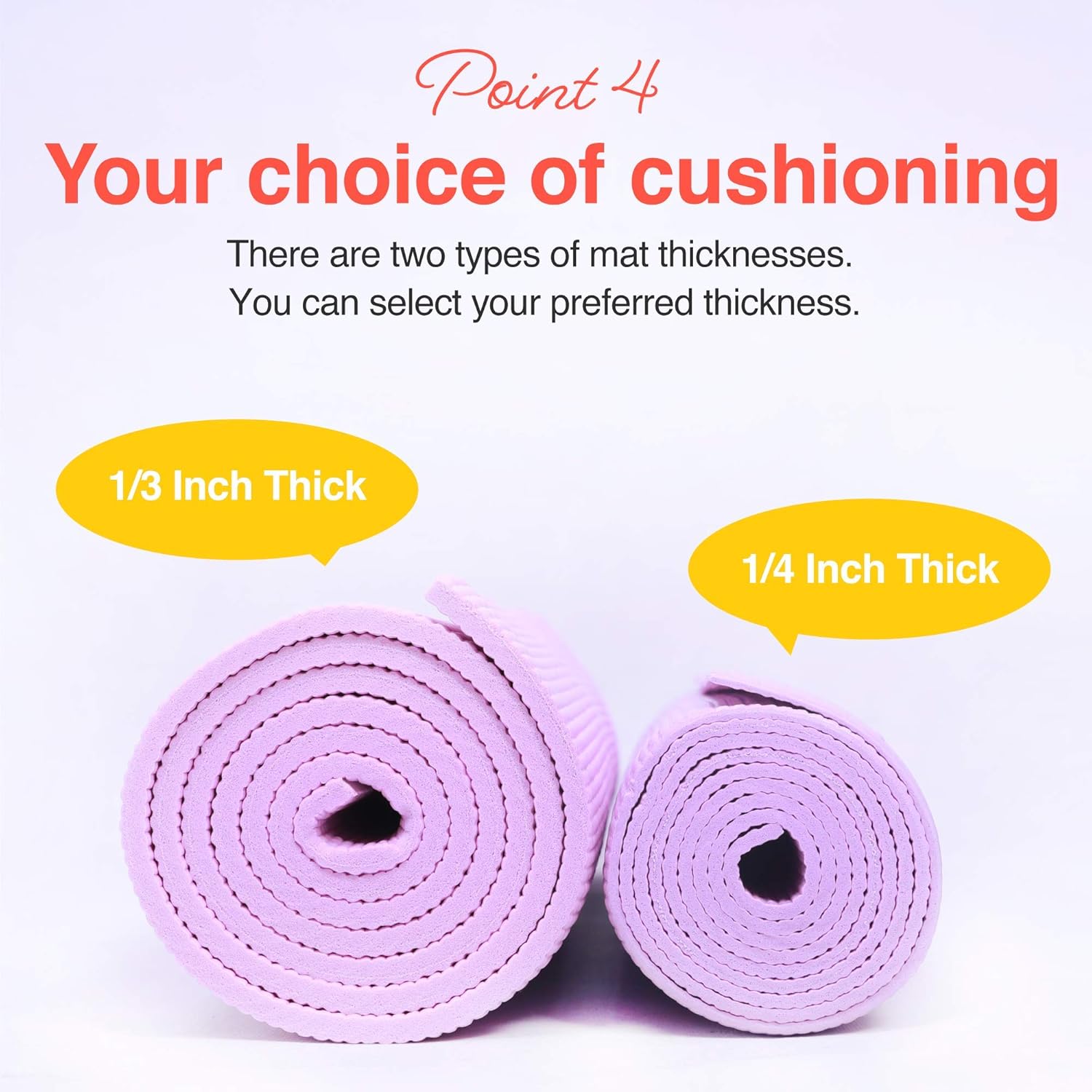 - ใCHOICE OF SEVEN COLORSใ Coordinate with any mood, style, or preference. Durable PVC resists peeling, fading, or tearing and wipes clean for easy everyday use. Also yoga mats are made with an embossed, cushioned, and comfortable material, so they can be used safely for a variety of yoga poses.