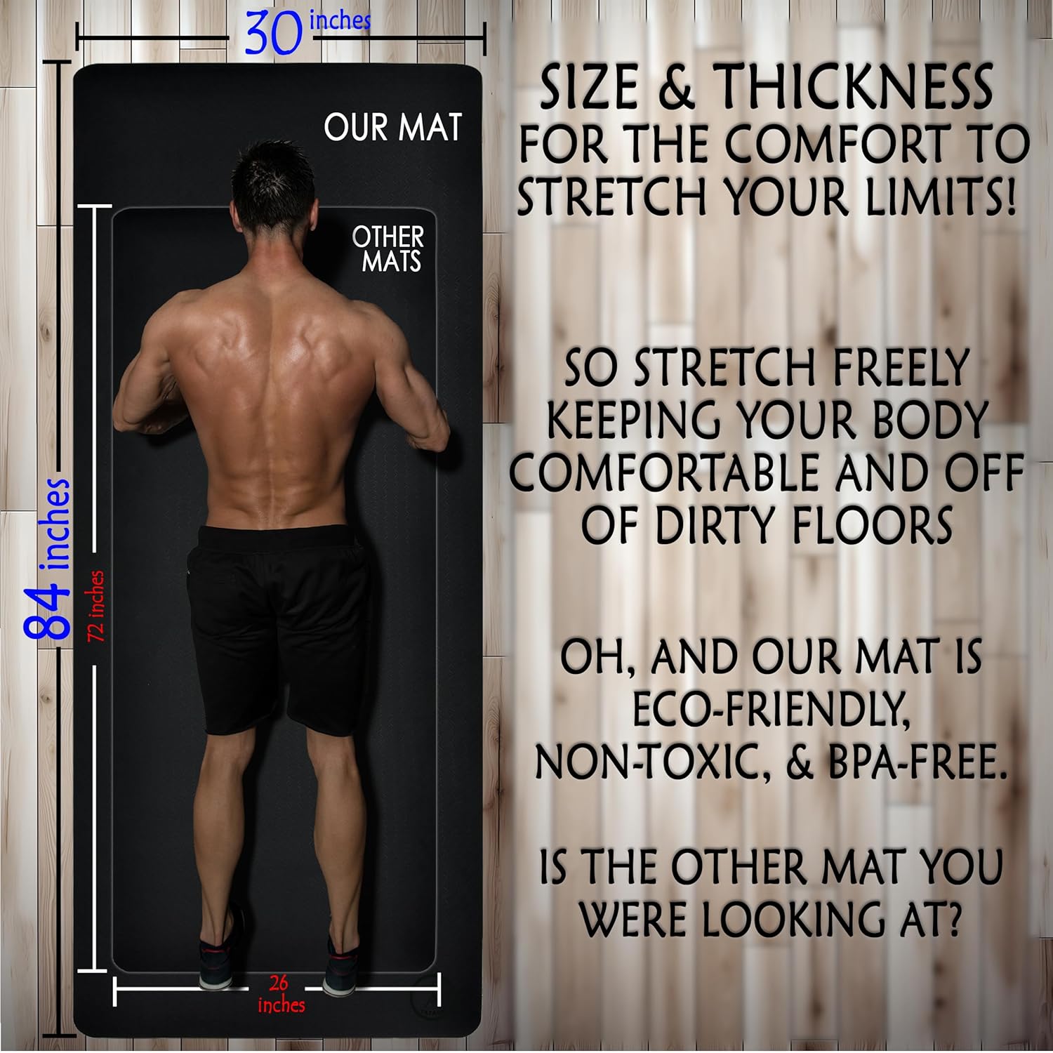 - Our impressive 84-inch XL yoga mat extra thick wide and long gives you an unrestricted practice area. And the yoga mat wide 30-inch width, ensures space for comfortable, unrestricted movements throughout your practice, catering to taller individuals and anyone seeking extra space to push their limits.