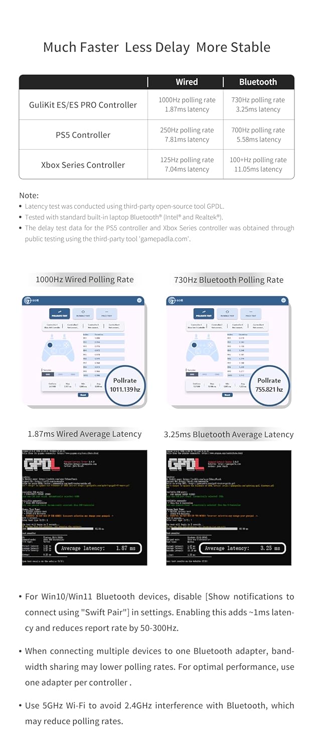 - WORLD FASTEST WIRELESS SPEED: Featuring GuliKit Hyperlink 2 revolutionary wireless dynamic channel selection technology, delivers the world lowest 3.25ms delay with 730Hz polling rate in Bluetooth mode on PC, and the lowest 1.87ms delay with 1000Hz polling rate in wired mode. With the legit breakthrough in wireless tech,it offers the world fastest speed and e-sports-level responsiveness.