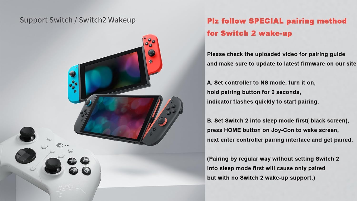 - INSTANT SWITCH 1 / 2 WAKE-UP: Supports Switch 1 / 2 with wake-up capability. Make sure to follow SPECIAL pairing method for Switch 2 wake-up: A. Set controller to NS mode, turn it on, hold pairing button for 2 seconds, indicator flashes quickly to start pairing. B. Set Switch 2 into sleep mode first( black screen), press HOME button on Joy-Con to wake screen, next enter controller pairing interface and get paired. (Pairing by regular way without setting Switch 2 into sleep mode first will cause only paired but with no Switch 2 wake-up support.) Please check the uploaded video for pairing guide and make sure to update to latest firmware on our site.