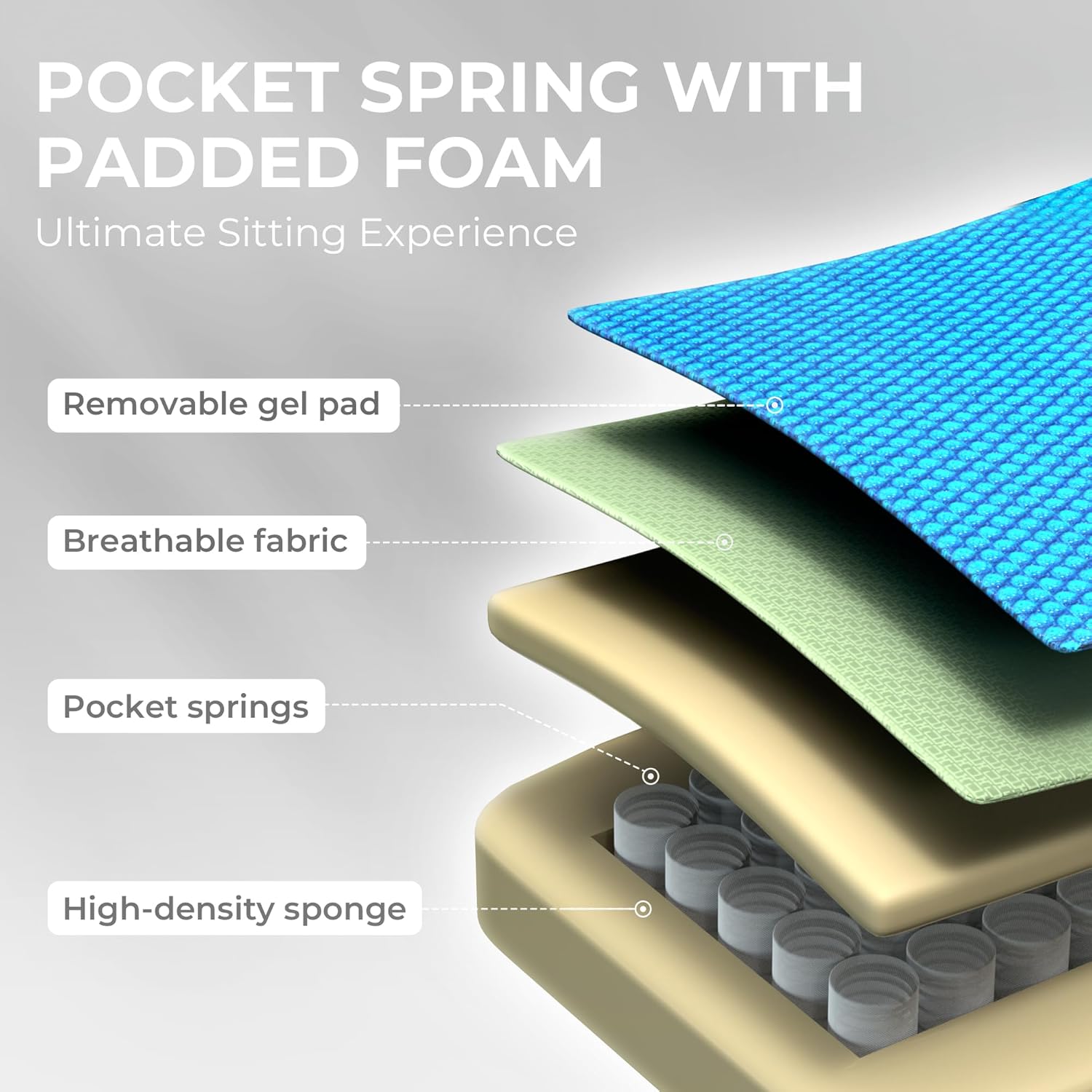 - Individually Pocket Springs: The seat cushion features pocket springs, a technique commonly used in sofas. Each spring operates independently, conforming to pressure and body weight to deliver resilient support and a luxurious comfort experience comparable to high-end gaming chairs.