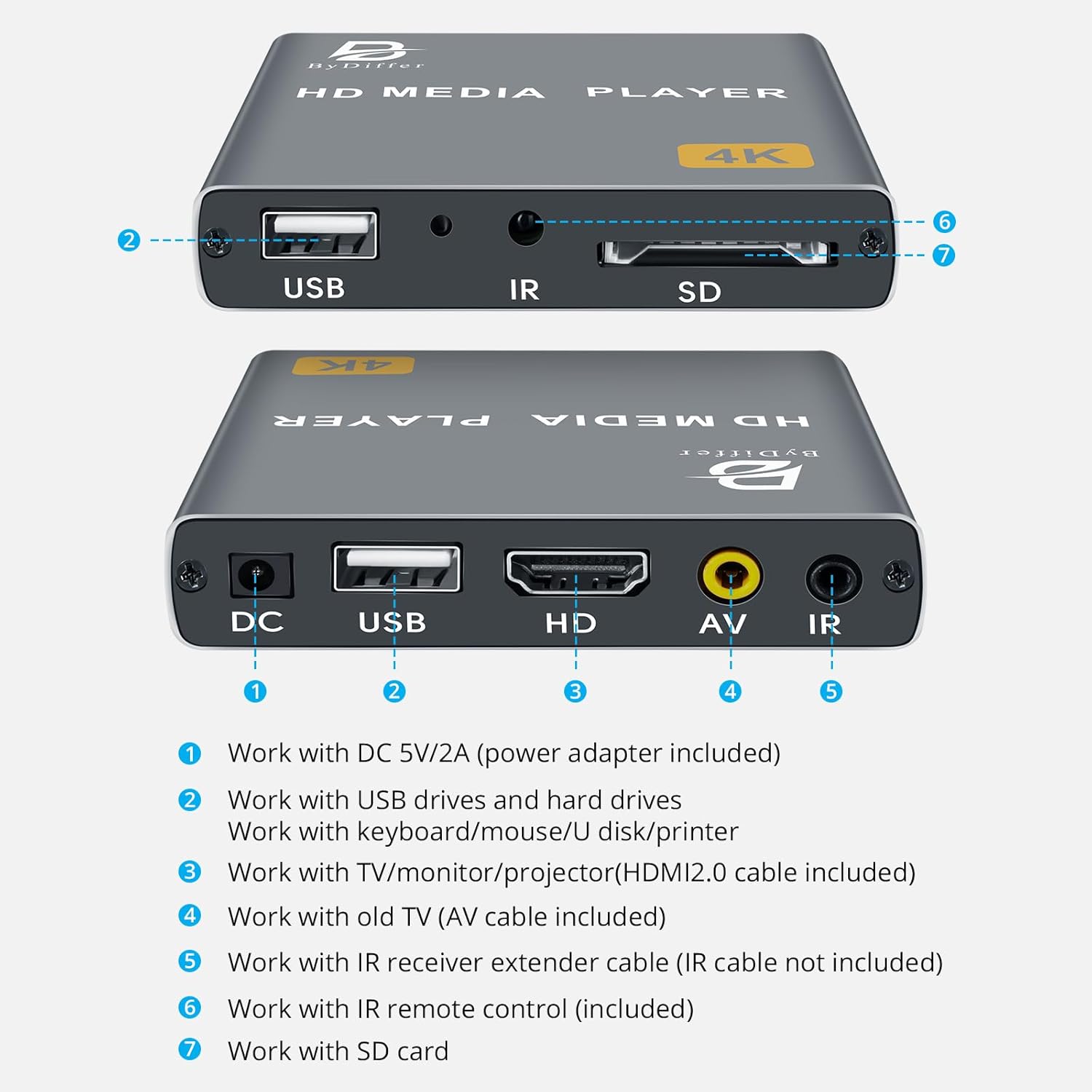 - HDMI/AV Output: The digital video player allows you to play videos, music, and photo slideshows or presentations directly from USB drives or SD cards. The digital signage player can connect to both modern and older TVs, monitors, or projectors via HDMI, delivering impressive 4K video output.