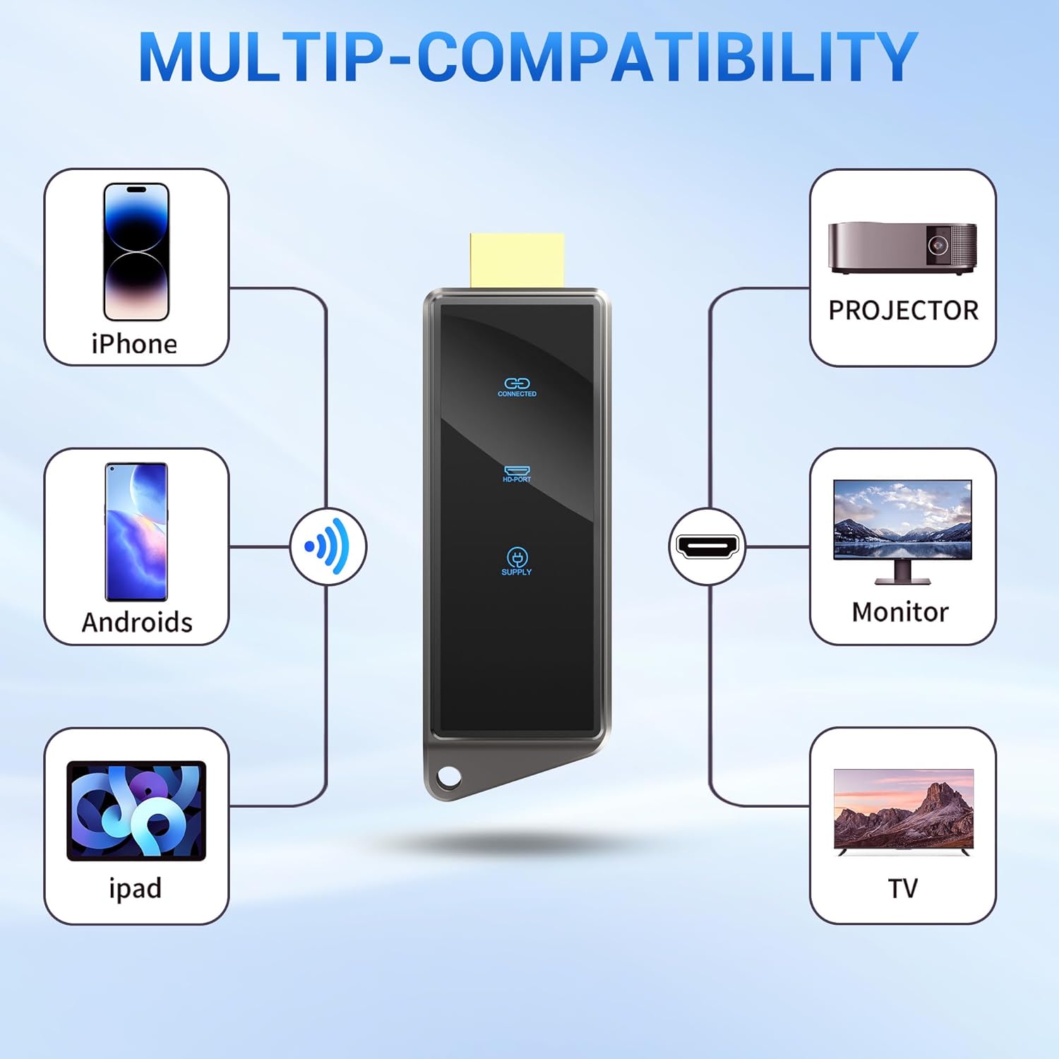 - Cross-Platform Compatibility: This portable Wireless HDMI Dongle Adapter supports Airplay for Apple IOS and MAC systems and Miracast for Android and Windows systems. Its powerful Integrated chipset ensures compatibility with a wide range of HDMI output devices. Easily switch between landscape and portrait modes for a versatile viewing experience. It’s perfect choice for conference rooms, home entertainment, and multimedia education.