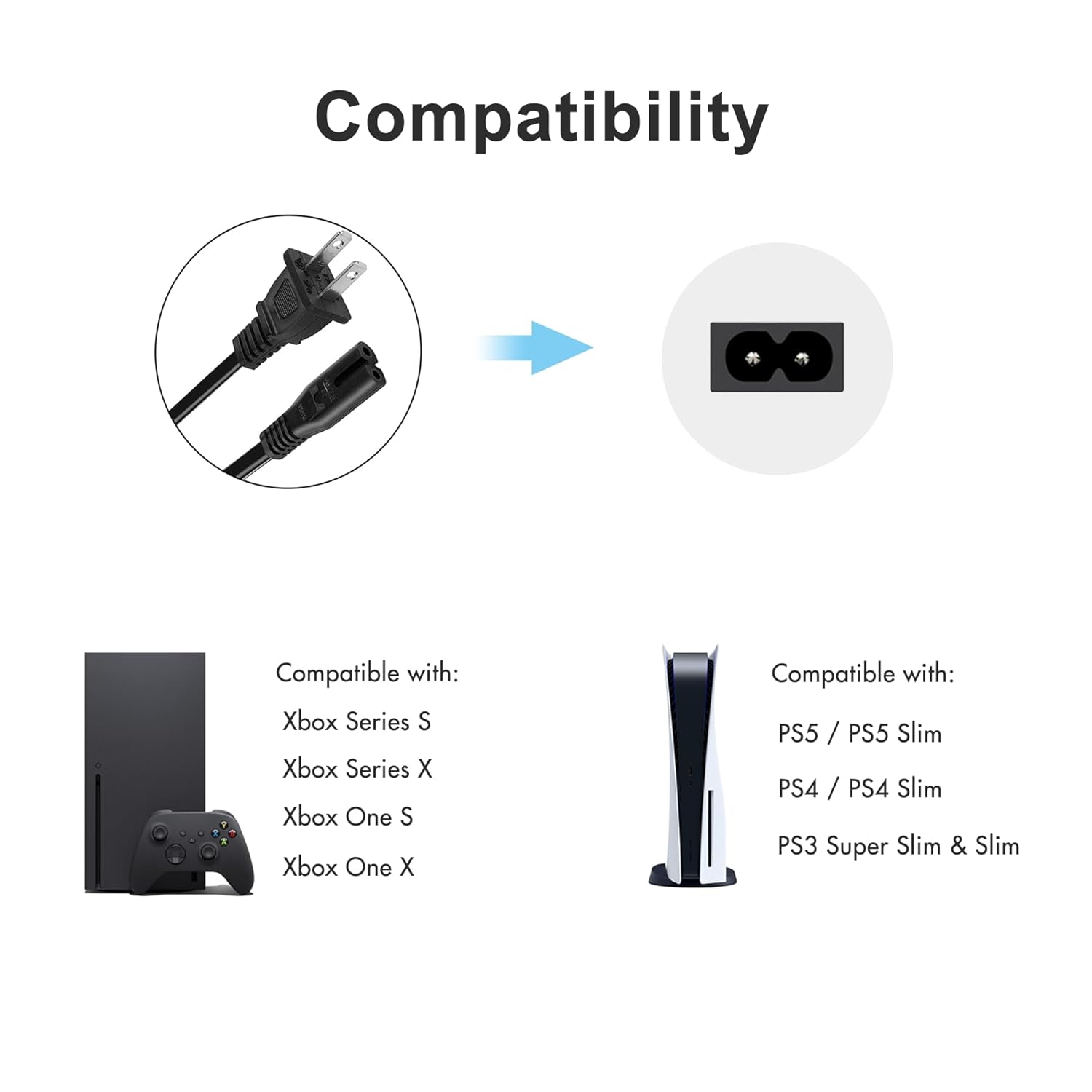About TPLTECH AC Power Cord Compatible with Xbox One S/X, Xbox Series X/S, PS4/PS5/PS3 Slim, 2 Prong Universal Power Cable Replacement