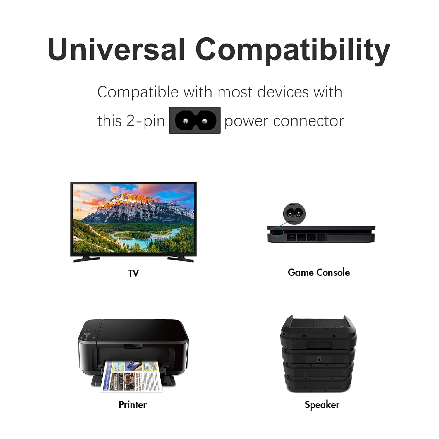 - Universal Compatibility: Fits Game Console, TV, Printer, Sound Bar, Speaker System and Other Devices Requiring 2 Prong Power Cord