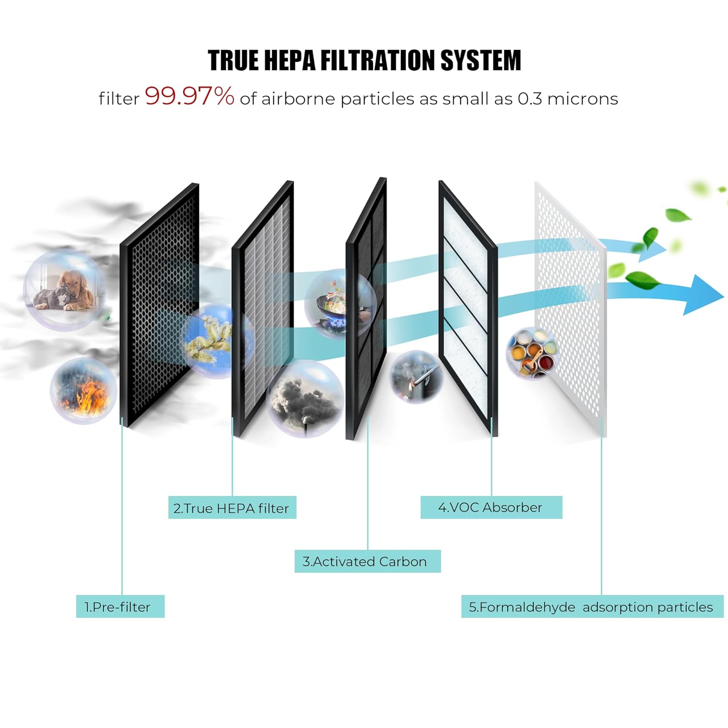 - Advanced 4-Stage Filtration System: Features a pre-filter, True HEPA filter and activated carbon filter to capture 99.97% of particles, including dust, smoke, and pet dander, for superior air quality.