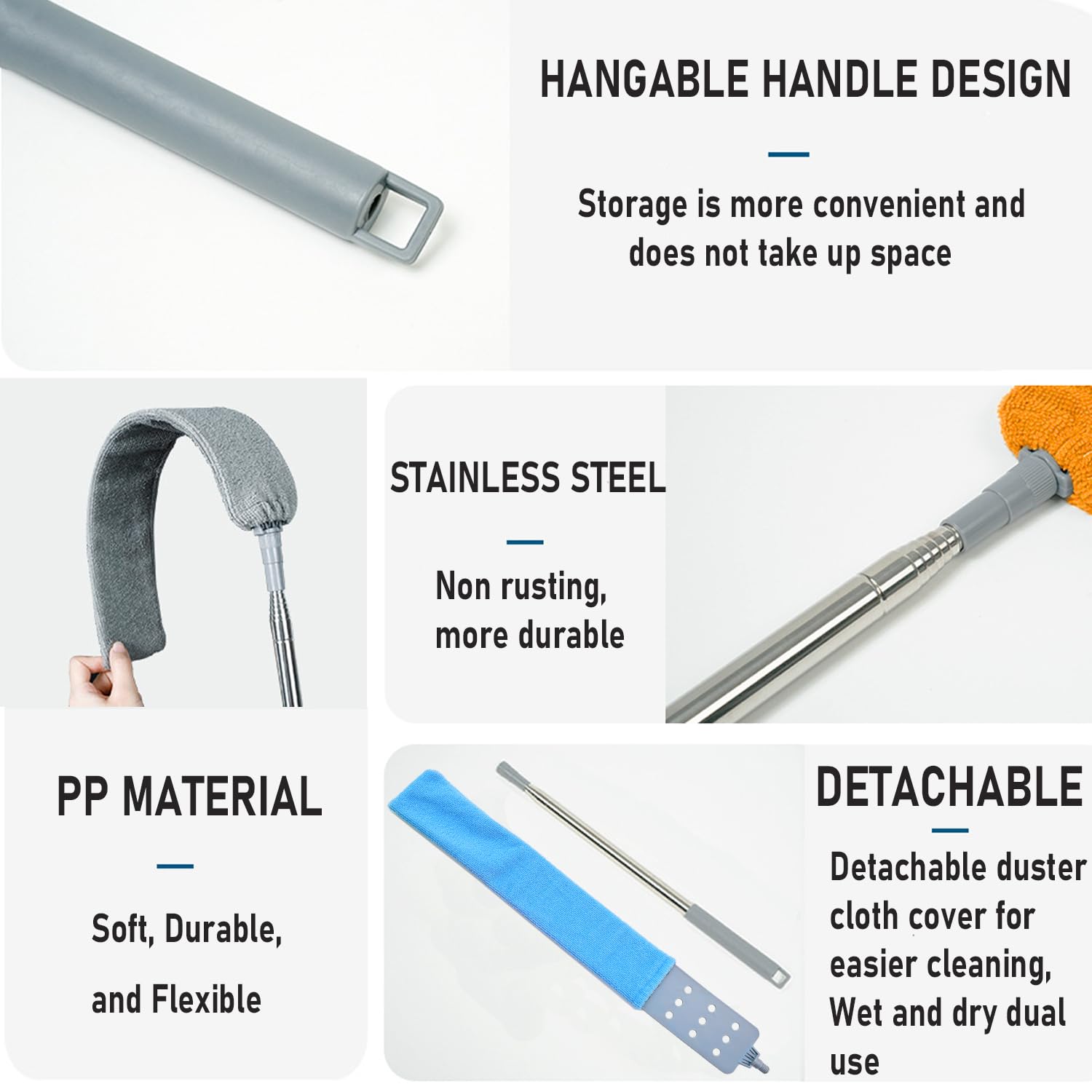 - Make Housework Easier: It gets electrostatically charged when in use, easily attracting dust and hairs. It can be used wet or dry, leaving your home spotlessly clean. The lightweight, sturdy and durable microfiber long duster with a telescoping pole and a long handle can help you reach corners, gaps, beside the bed, the bottom of furniture and narrow spaces that are hard to clean, making it convenient for you to clean different places.