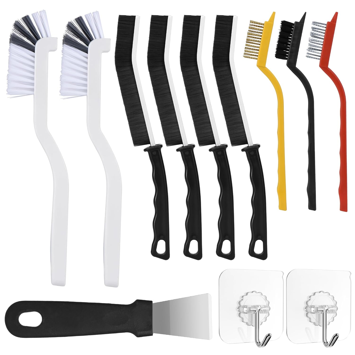 - Efficient Cleaning Brush Set- Our cleaning supplies provides 4 crevice brushes for window, kitchen and bathroom, 3 wire crevice brushes for Range hoods,Countertop Gap,Barbecue net cleaning and 1 scraper for removing stubborn stains,2 right angle brushes to clean bottle,blender better and other crevice place.Extra gift included two hooks.Ideal as cleaning accessories for sinks, baseboards, window tracks, and even fan cleaning brushes for vents. Small cleaning brush heads reach where others canโtโno more dirt left behind!